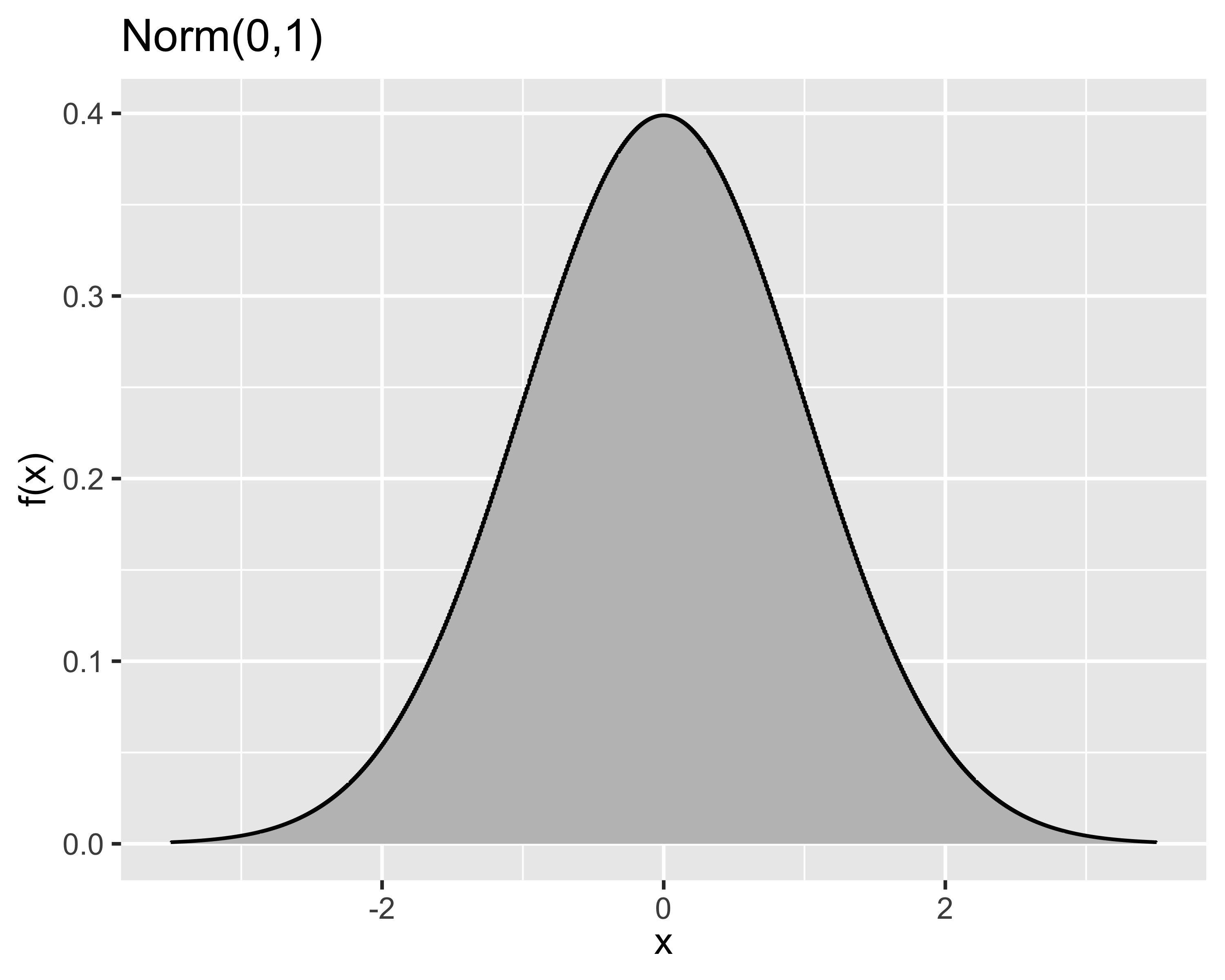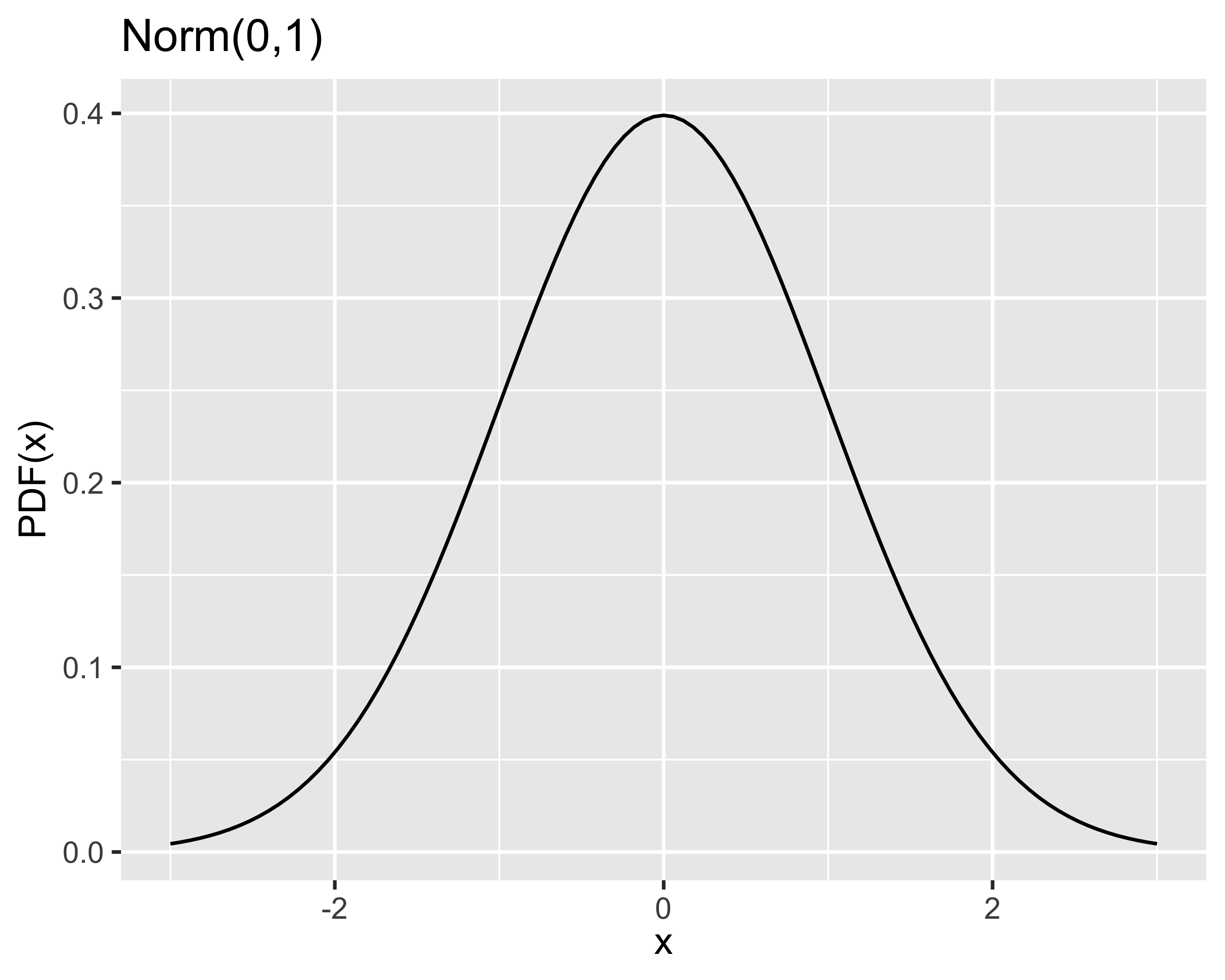 Si dice che \(x\sim\mathrm{Norm}(\mu,\sigma^2)\) oppure \(x\sim\mathcal{N}(\mu,\sigma^2)\) quando la PDF è: \[ f(x) =\frac{1}{\sigma \sqrt{2 \pi}}e^{-\frac{1}{2}\left[\frac{x-\mu}{\sigma}\right]^2} \]