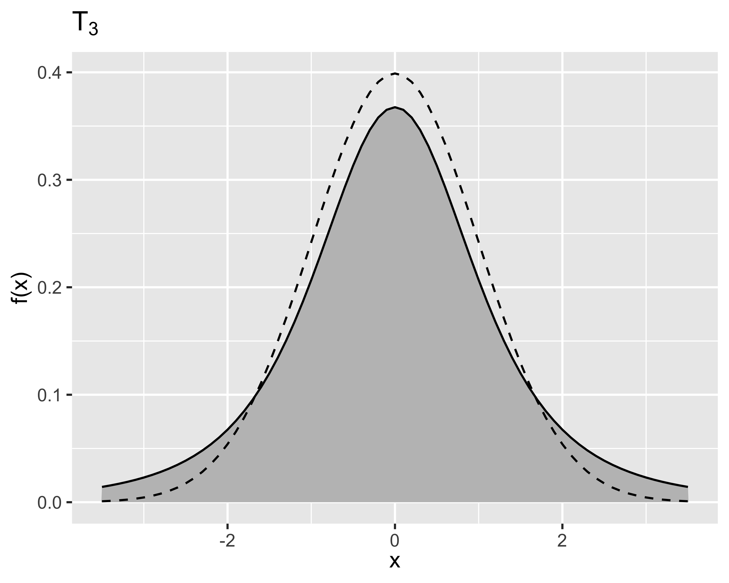 La T di Student è un caso particolare della \(\mathcal{N}(0,1)\): \[ \lim_{k\rightarrow+\infty}t_k=\mathcal{N}(0,1) \] La convergenza è molto rapida: già per \(k>30\) la differenza tra le due funzioni di distribuzione diventa trascurabile