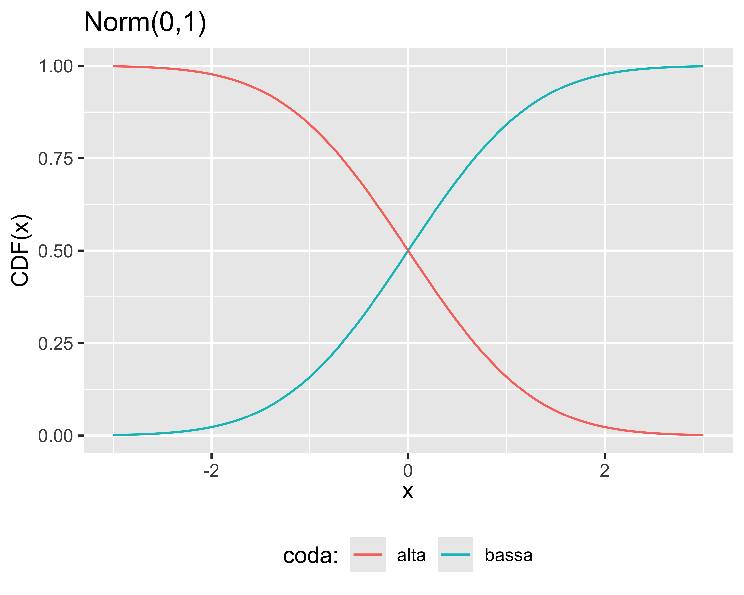 Se \(x\sim\mathcal{N}(\mu, \sigma^2)\) allora \[ \frac{x-\mu}{\sigma}\sim\mathcal{N}(0,1) \] e la distribuzione \(\mathcal{N}(0,1)\) è detta normale standard.