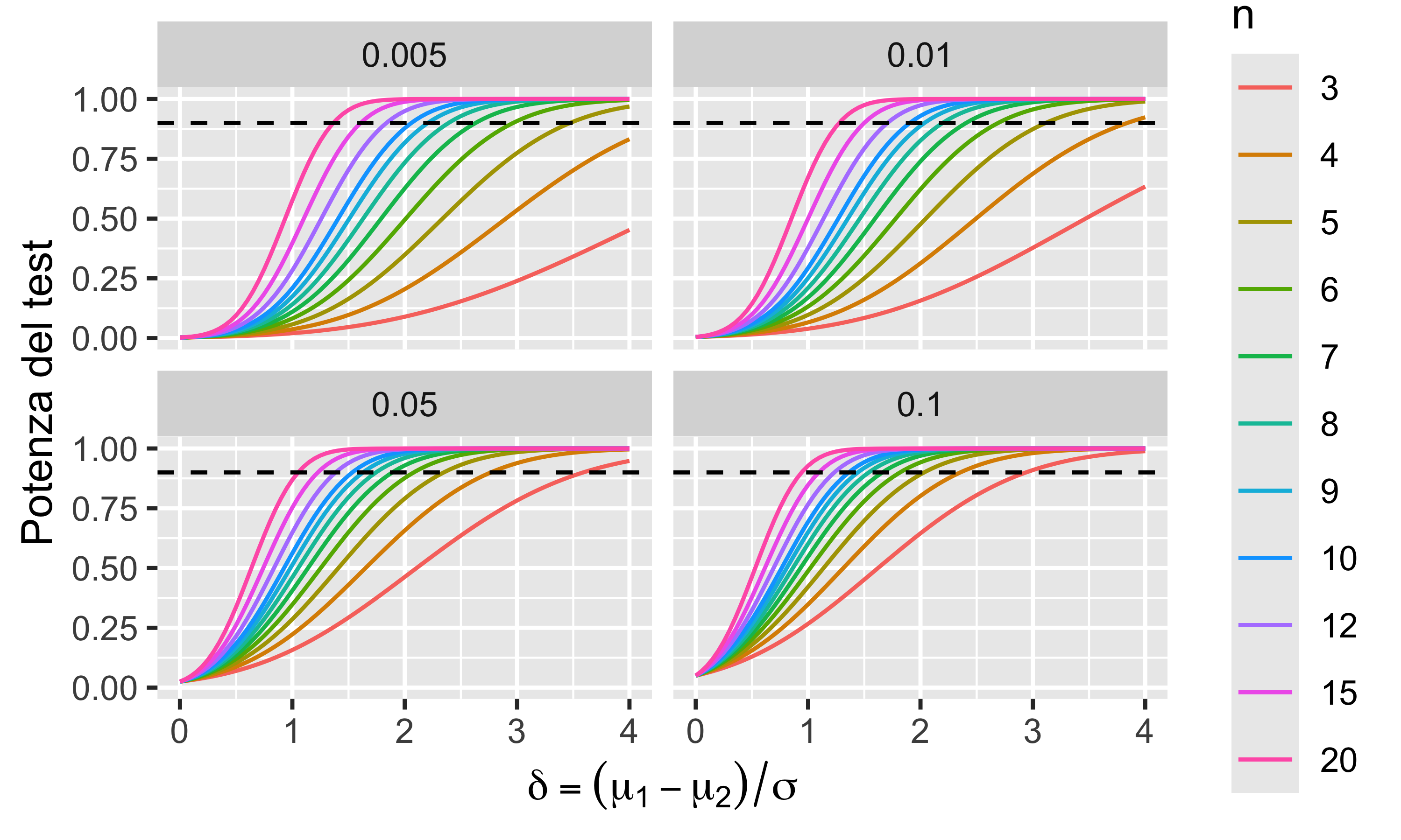 Se però passiamo da campioni da 15 elementi a campioni da 30 elementi (Caso B) la potenza del test aumenta sensibilmente, a pari condizioni