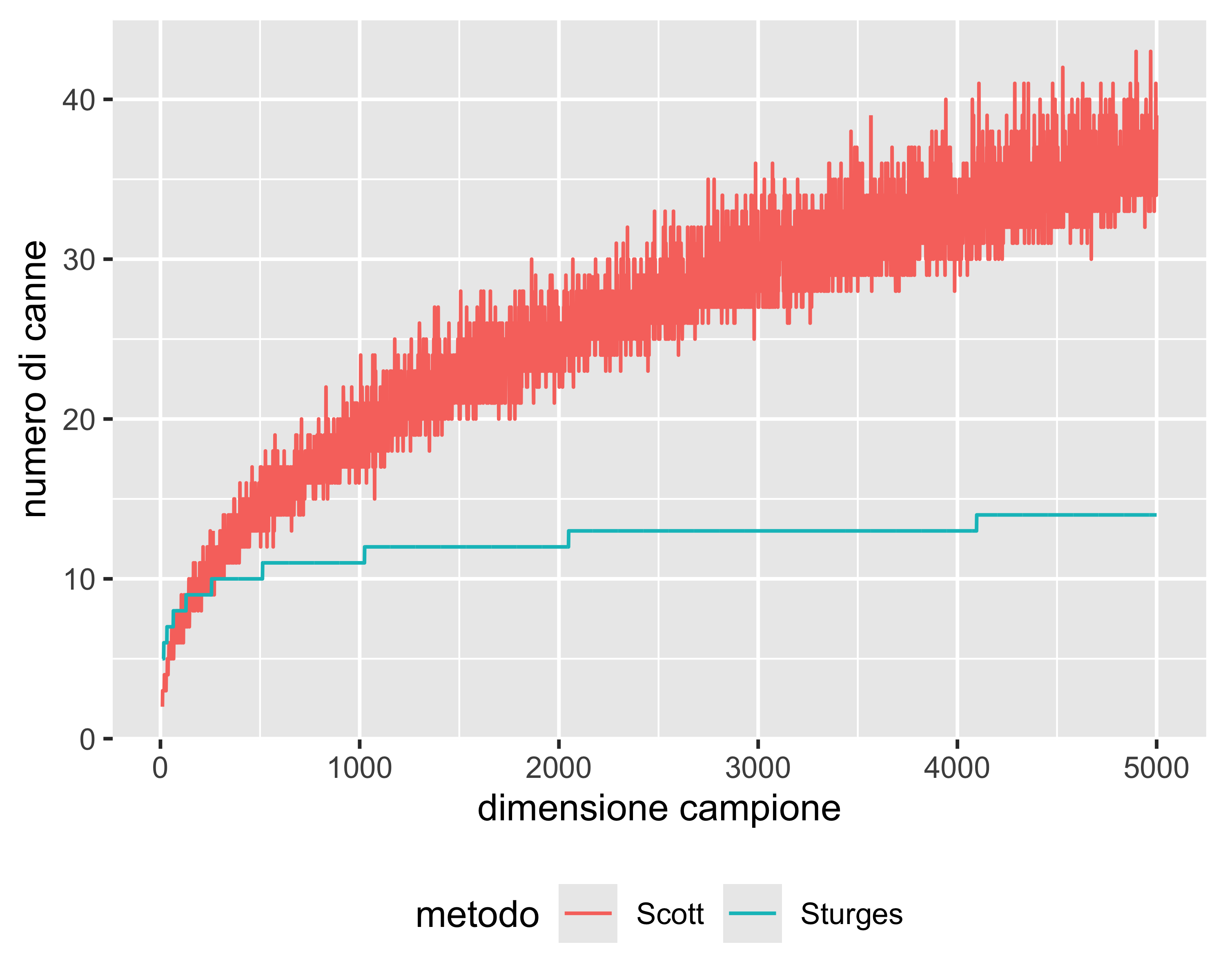 Per il numero di canne, o bin, si usa la formula di Sturges: \(K = \lceil\log_2 n \rceil + 1\) o la formula di Scott: \(h=3.49 s / \sqrt[3]{n}\) (\(h\) è l’ampiezza della canna)