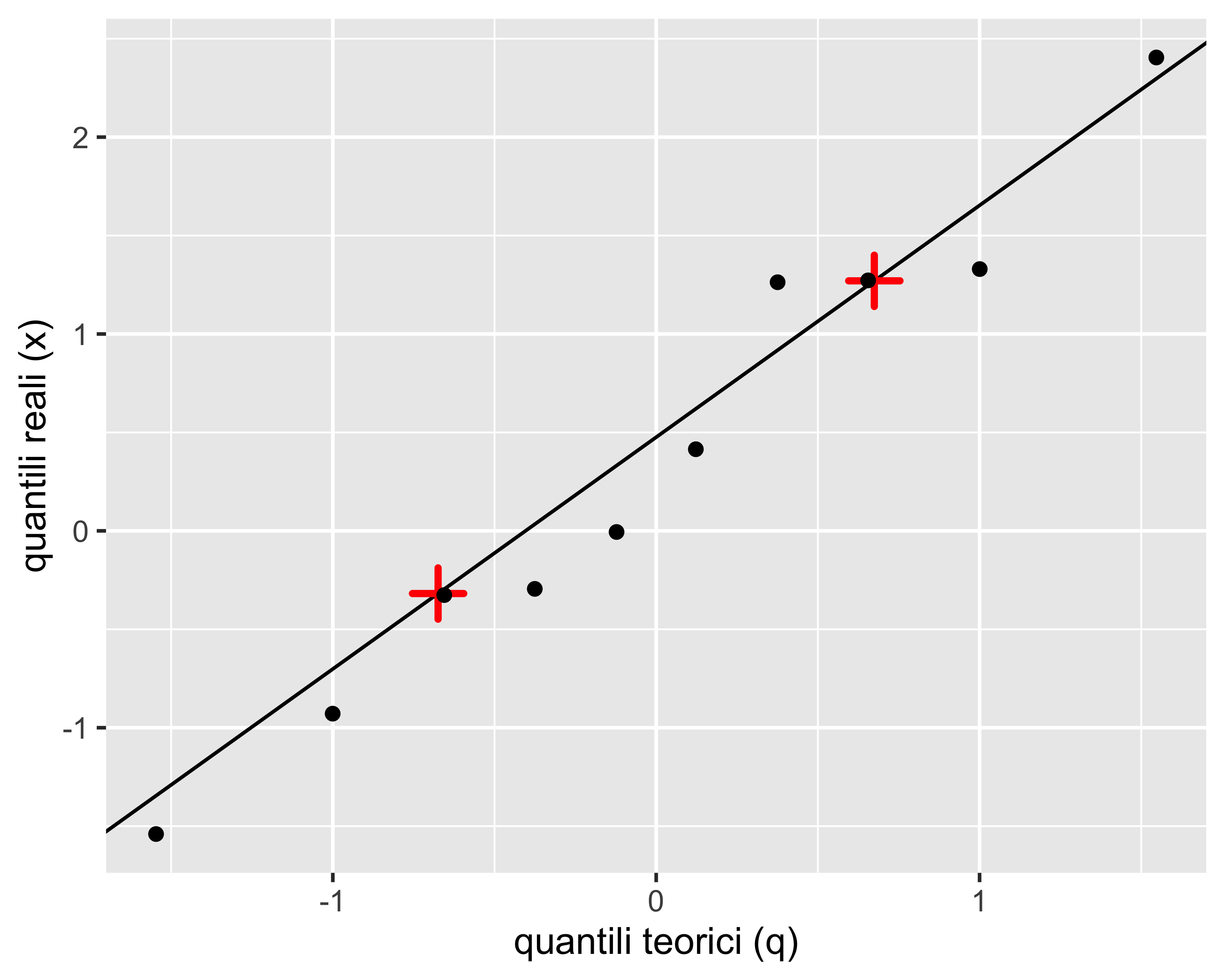 La colonna x sono le osservazioni ordinate; la ripartizione dei punti, colonna f, è corretta con la formula di Bloom: \(f=(1-3/8)/(n+1-3/4)\); la colonna q rappresenta i quantili normali standard di f.