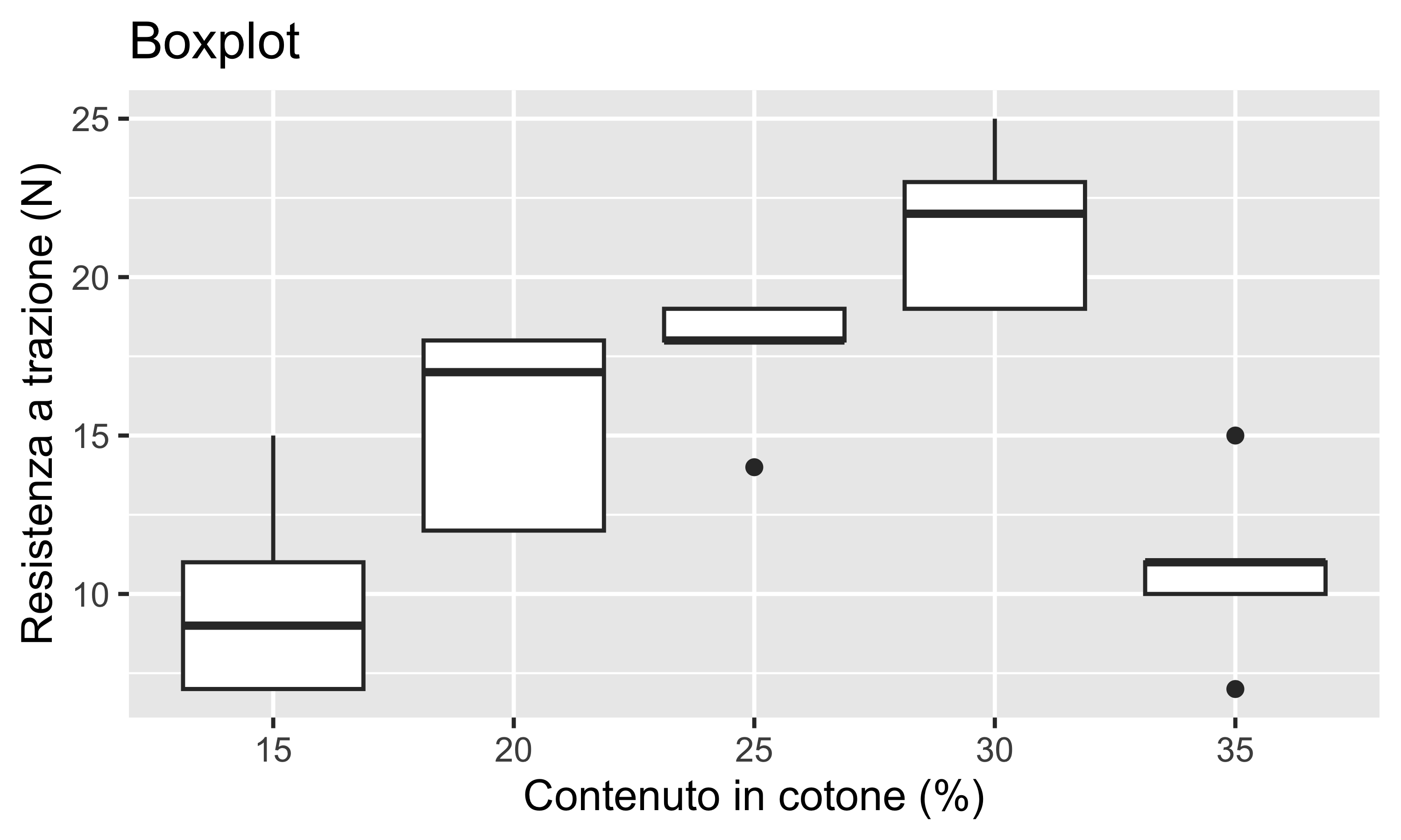 Esempio: resistenza a trazione di un filato in funzione della percentuale di fibre di cotone (fattore quantitativo)