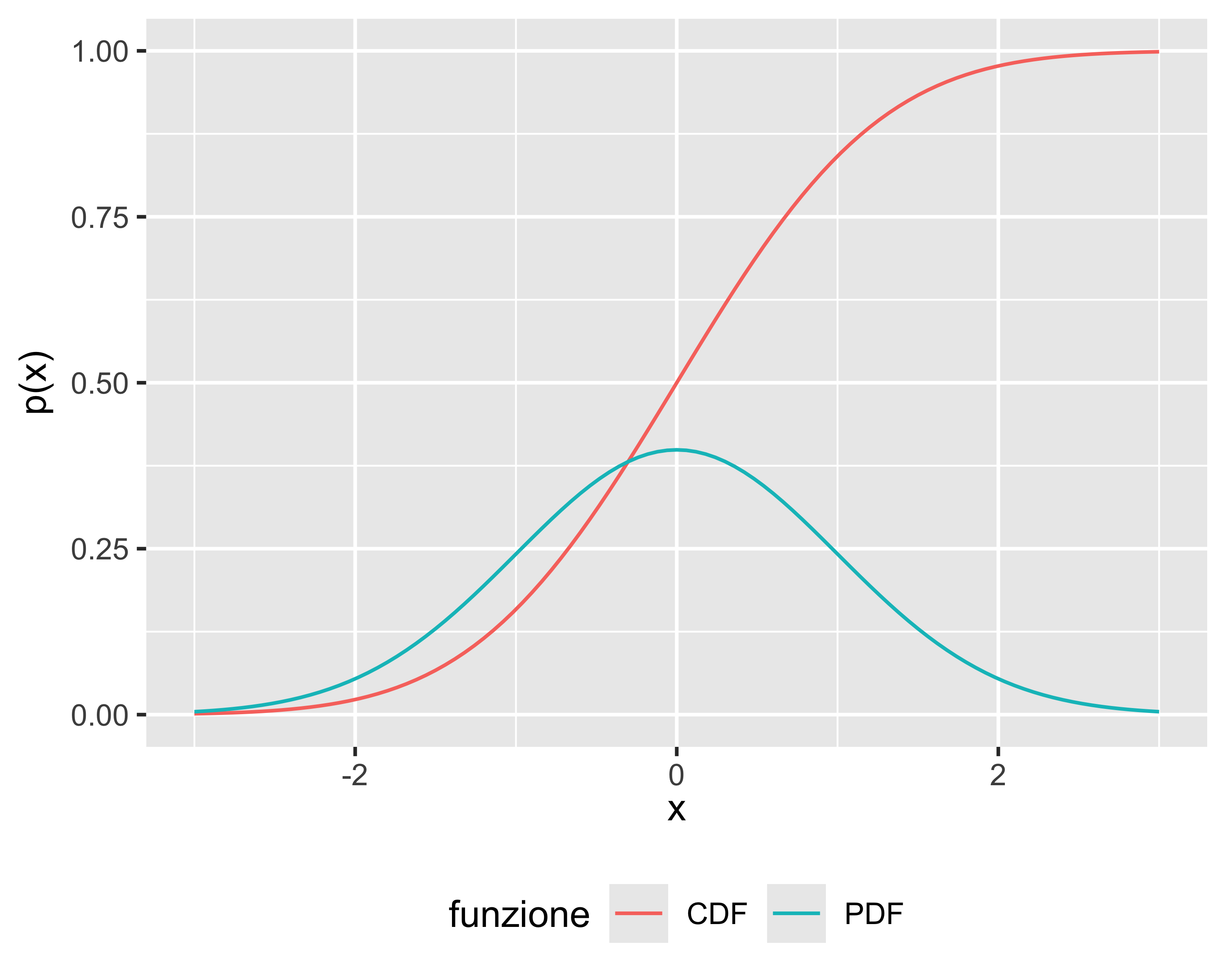 Inoltre, si noti che probabilità e frequenza devono sommare a 1: rispettivamente: \[ \begin{array}{l} \sum_i p(x_i) = 1 \\ \int_{-\infty}^\infty f(x)~\mathrm{d}x = 1 \end{array} \]