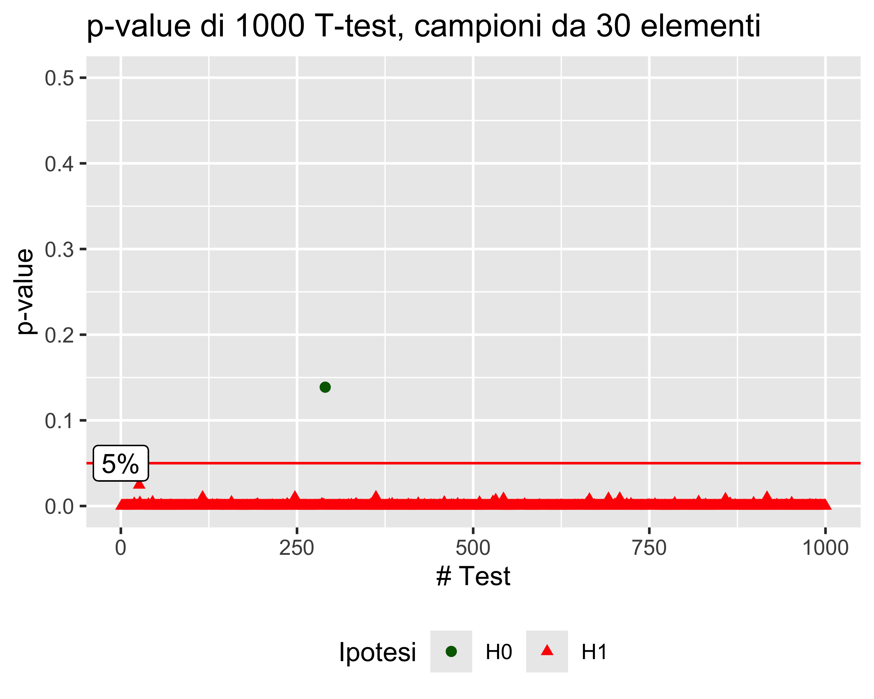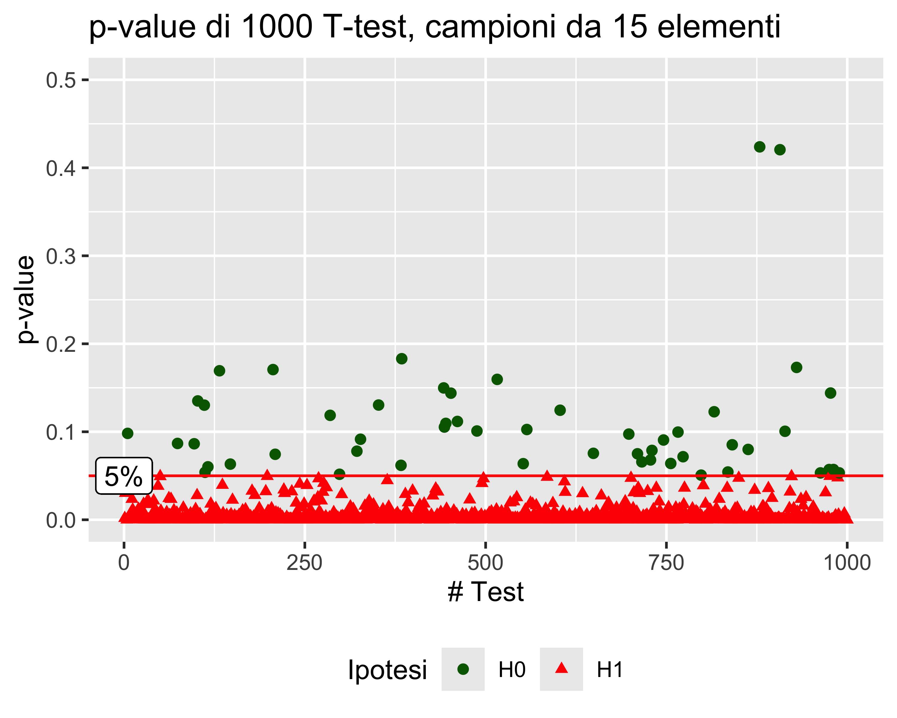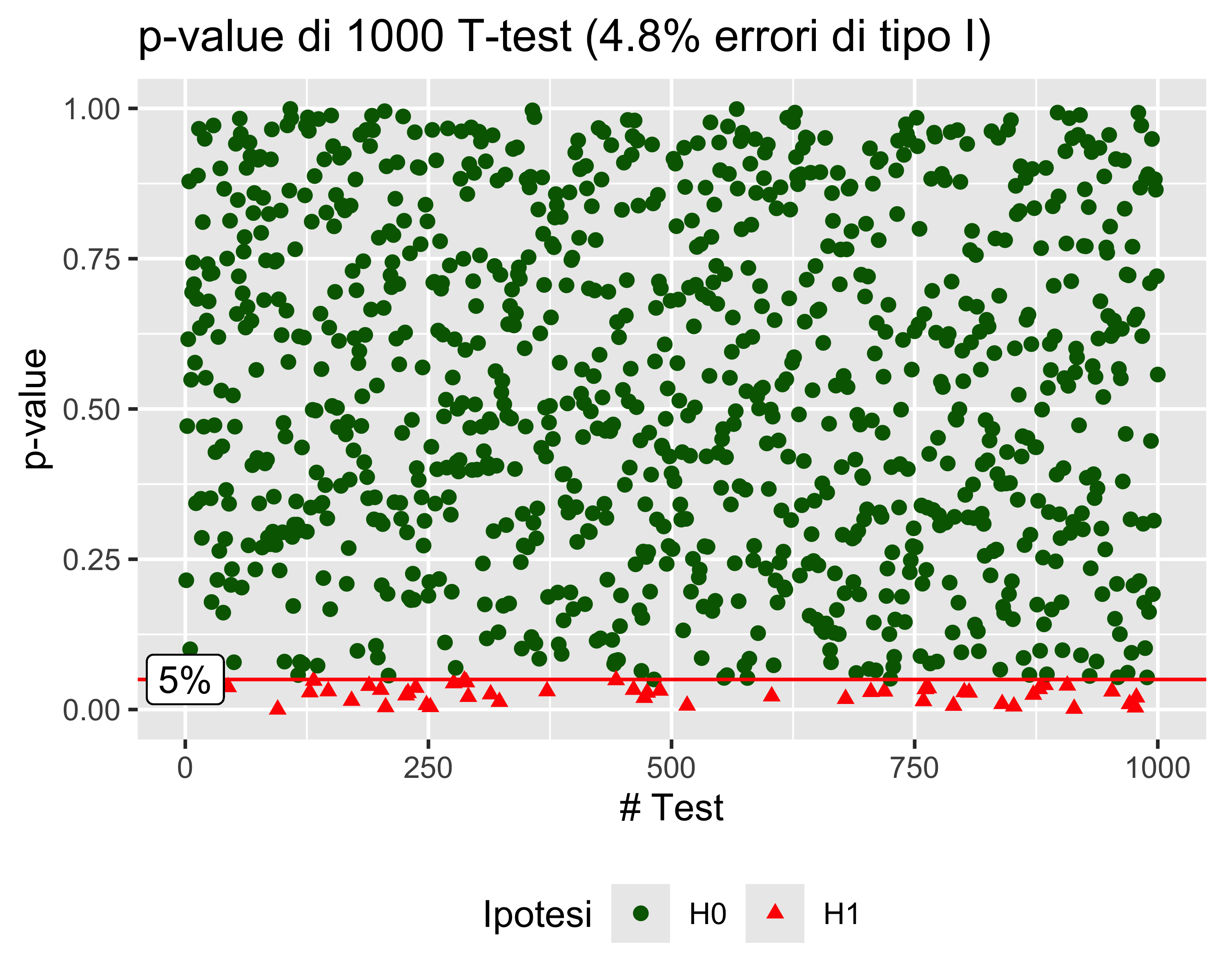 Il significato del \(p\)-value è illustrato con un esempio: si consideri un esperimento in cui si effettuano 1000 test di Student su altrettanti campioni di \(n=15\) elementi, ciascuno con un livello di significatività \(\alpha\) del 5%