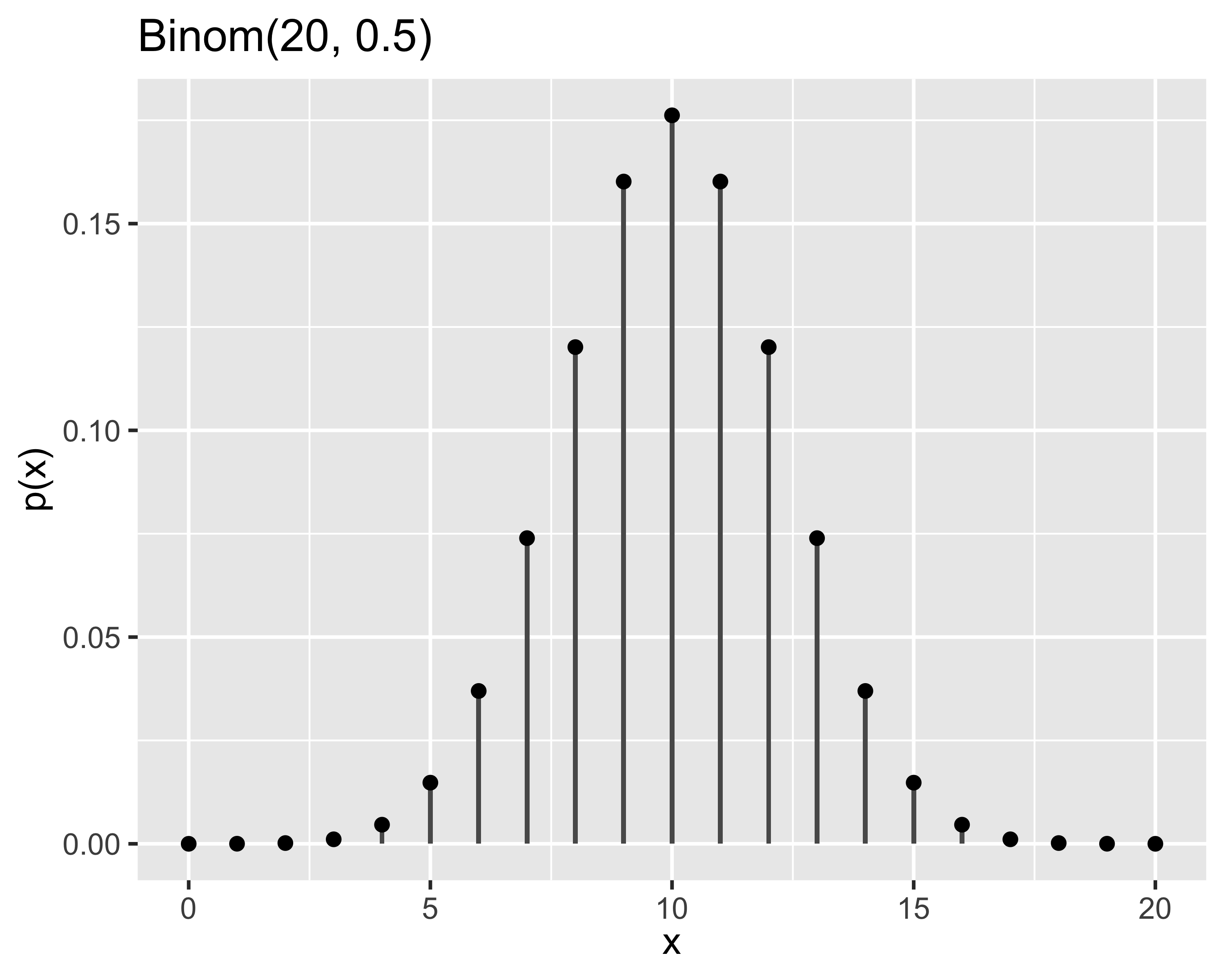La distribuzione binomiale descrive la probabilità di ottenere \(x\in[0, n]\) successi in \(n\) eventi