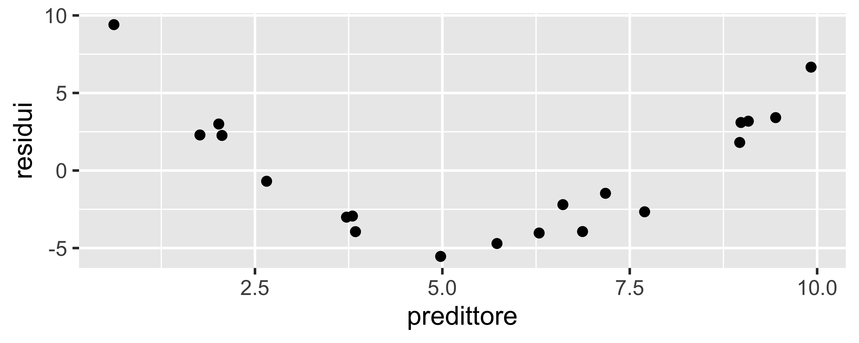 Può essere evidenziato, oltre che da un \(R^2\) basso, studiando la distribuzione dei residui: se c’è sotto-adattamento i residui possono essere non-normali e, soprattutto, mostrare degli andamenti, o pattern
