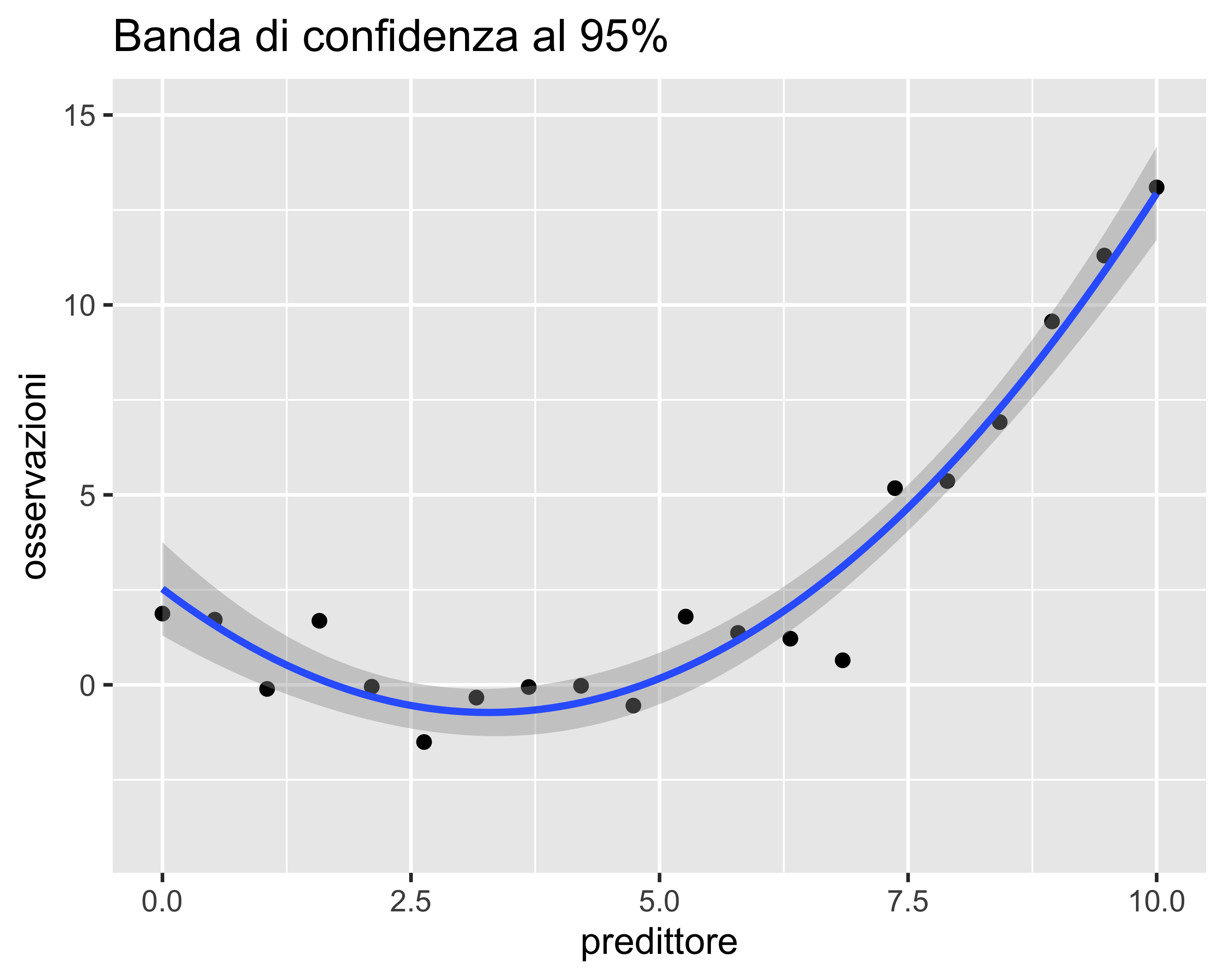 È ottenuto calcolando gli intervalli di confidenza sui parametri della regressione, calcolando poi—per ogni valore del predittore—il valore massimo e minimo della regressione corrispondente ai valori estremi dei parametri nei loro intervalli di confidenza
