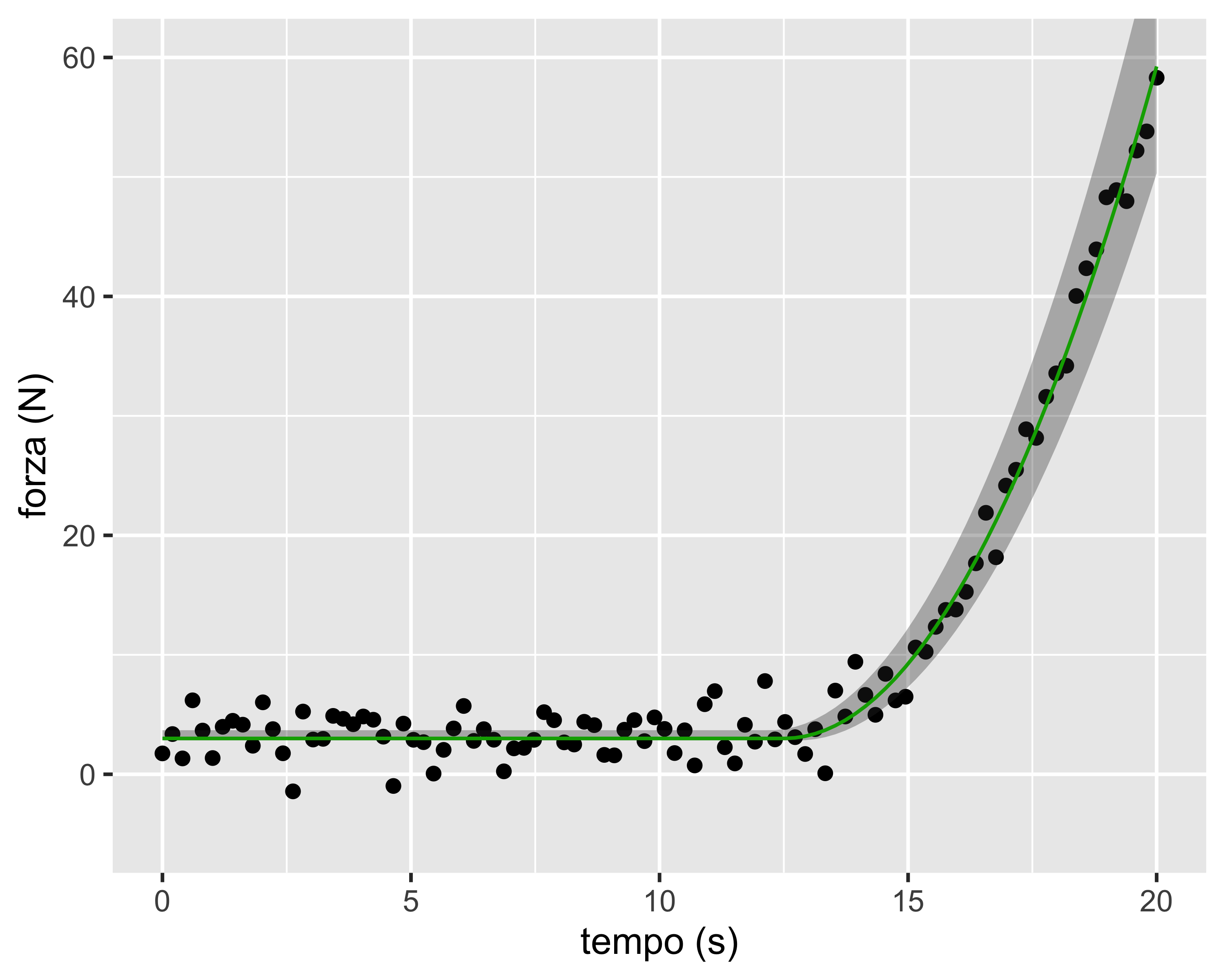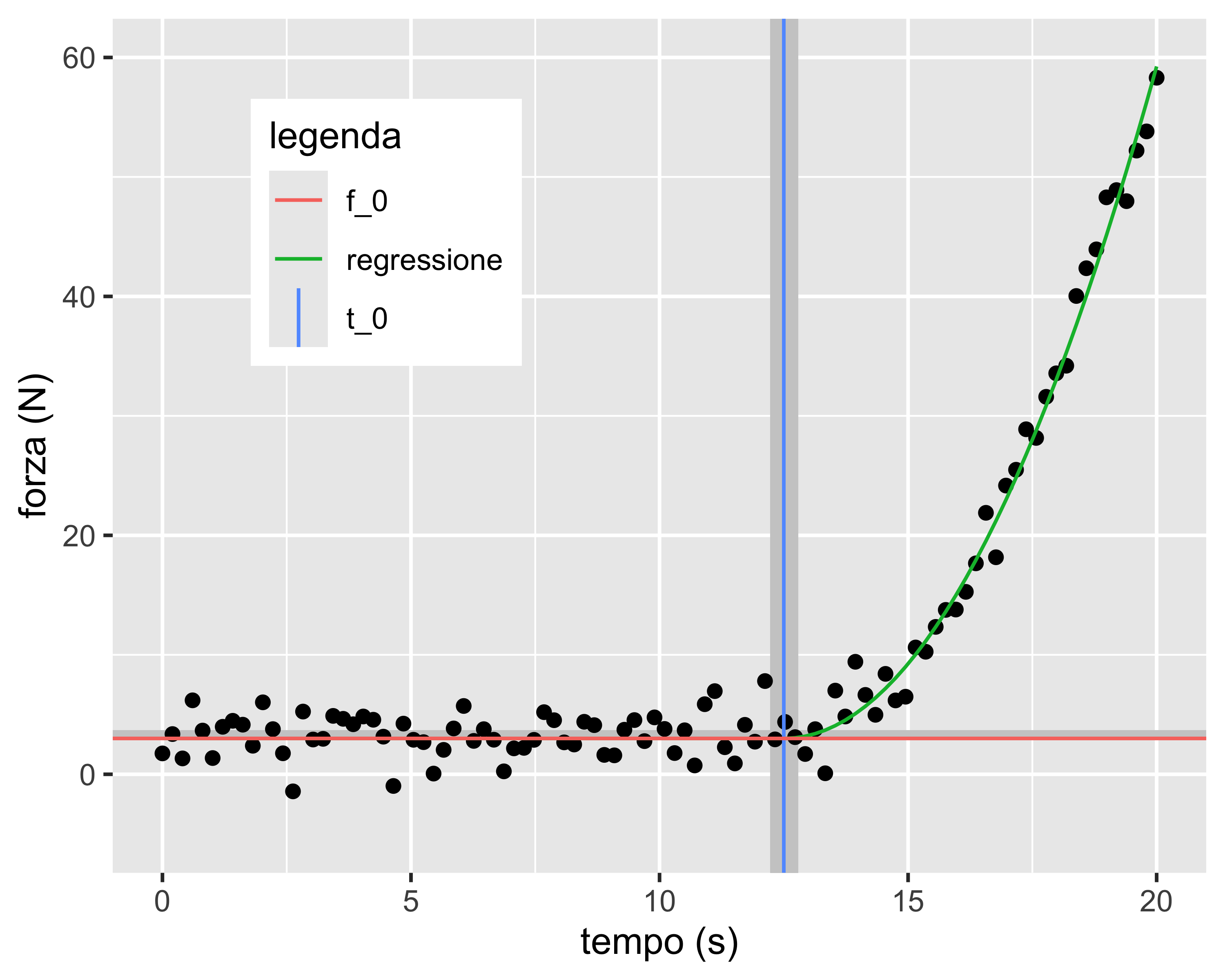 Siccome \(f(\cdot)\) deve essere continua con derivata continua, risulta \(2at_0+b=0\) e \(at_0^2+bt_0+c=f_0\) e quindi si hanno tre parametri: \[ f = \begin{cases} f_0 & t < t_0 \\ a t^2 - (2at_0)t + at_0^2+f_0 & t \geq t_0 \end{cases} \] Mediante regressione ai minimi quadrati e successivo bootstrap è possibile identificare l’istante di contatto e il relativo intervallo di confidenza per un assegnato livello di confidenza (in questo caso 95%)