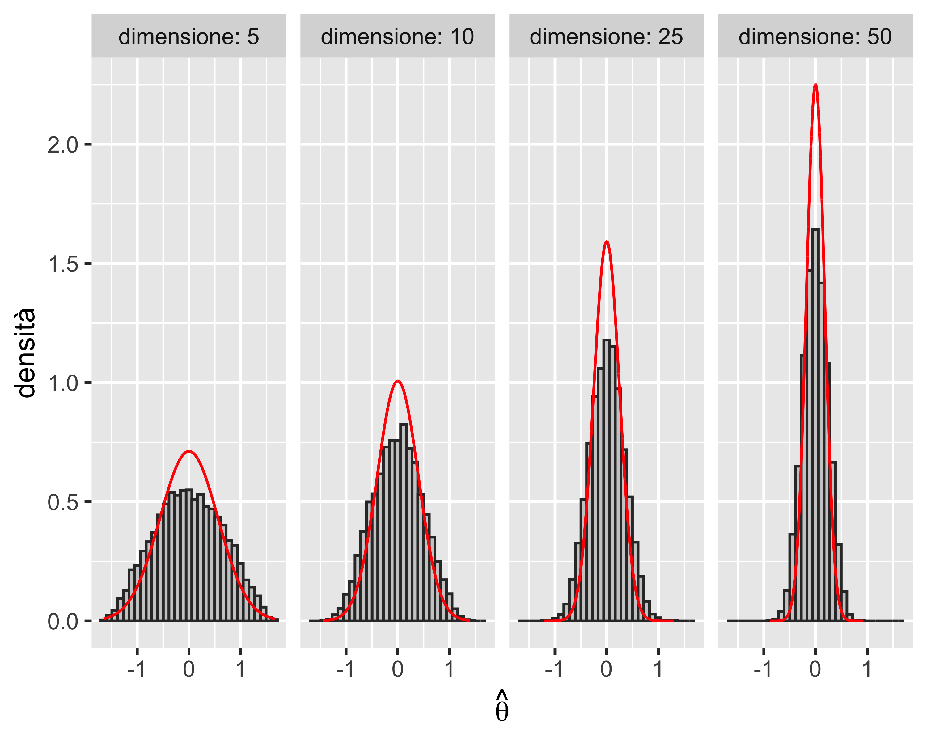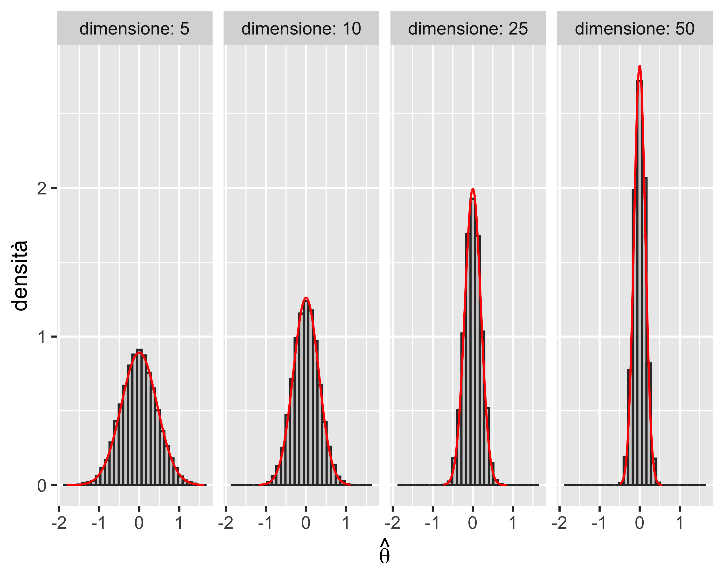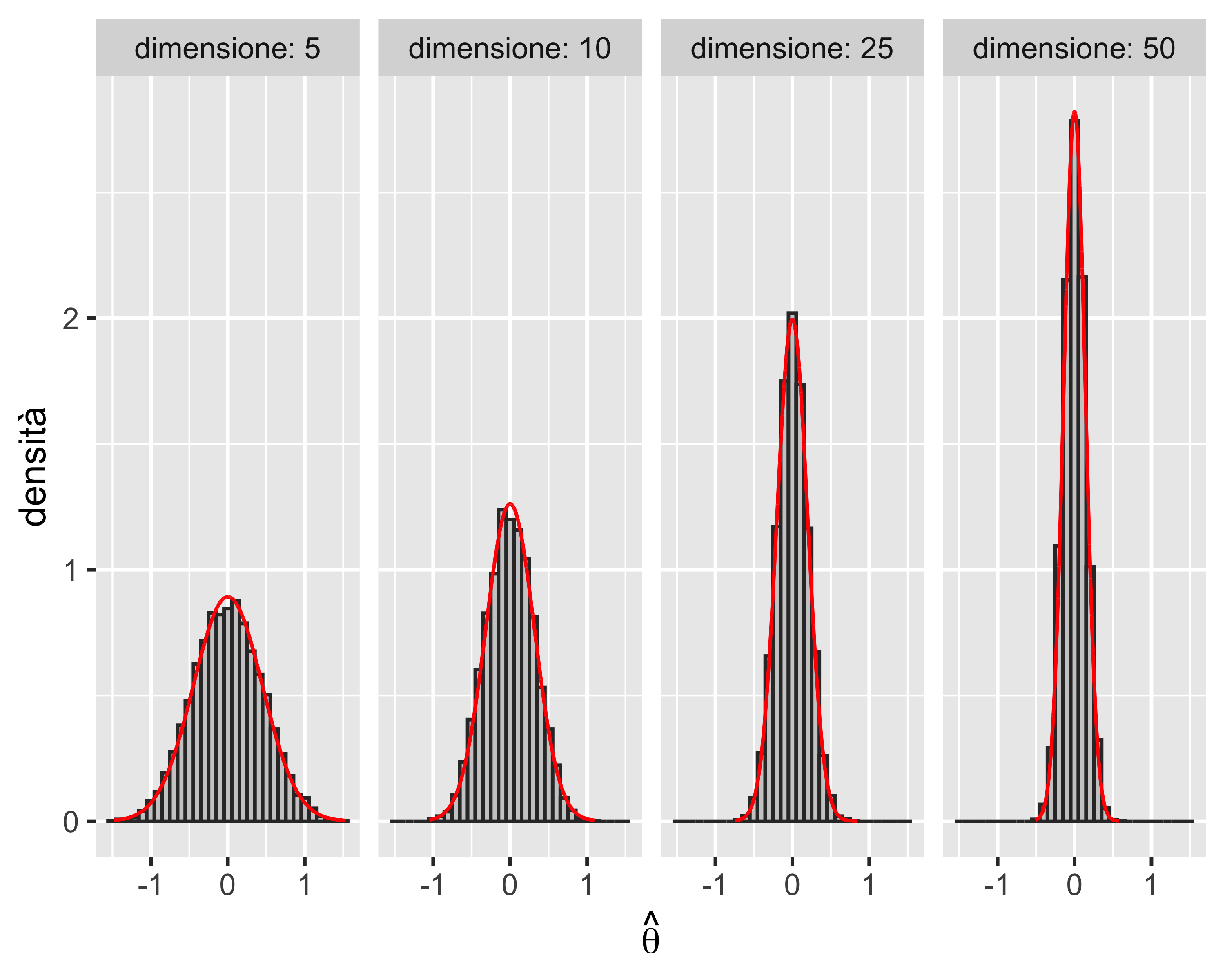 L’istogramma è pressoché perfettamente sovrapposto alla PDF di \(\mathcal{N}(\theta, \sigma^2/n)\), quale che sia il valore di \(n\)