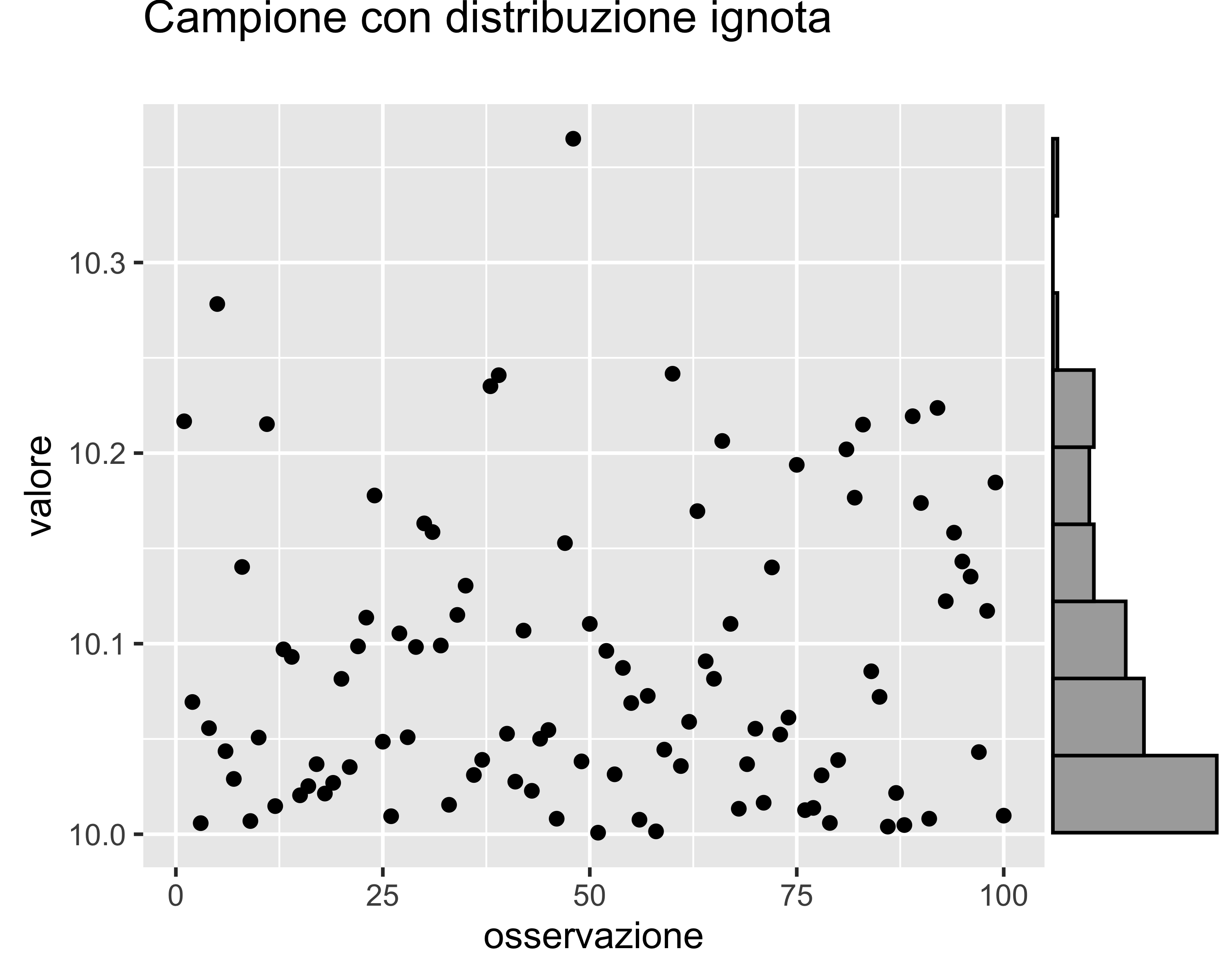Consideriamo un campione di \(n=100\) elementi provenienti da una popolazione con distribuzione ignota