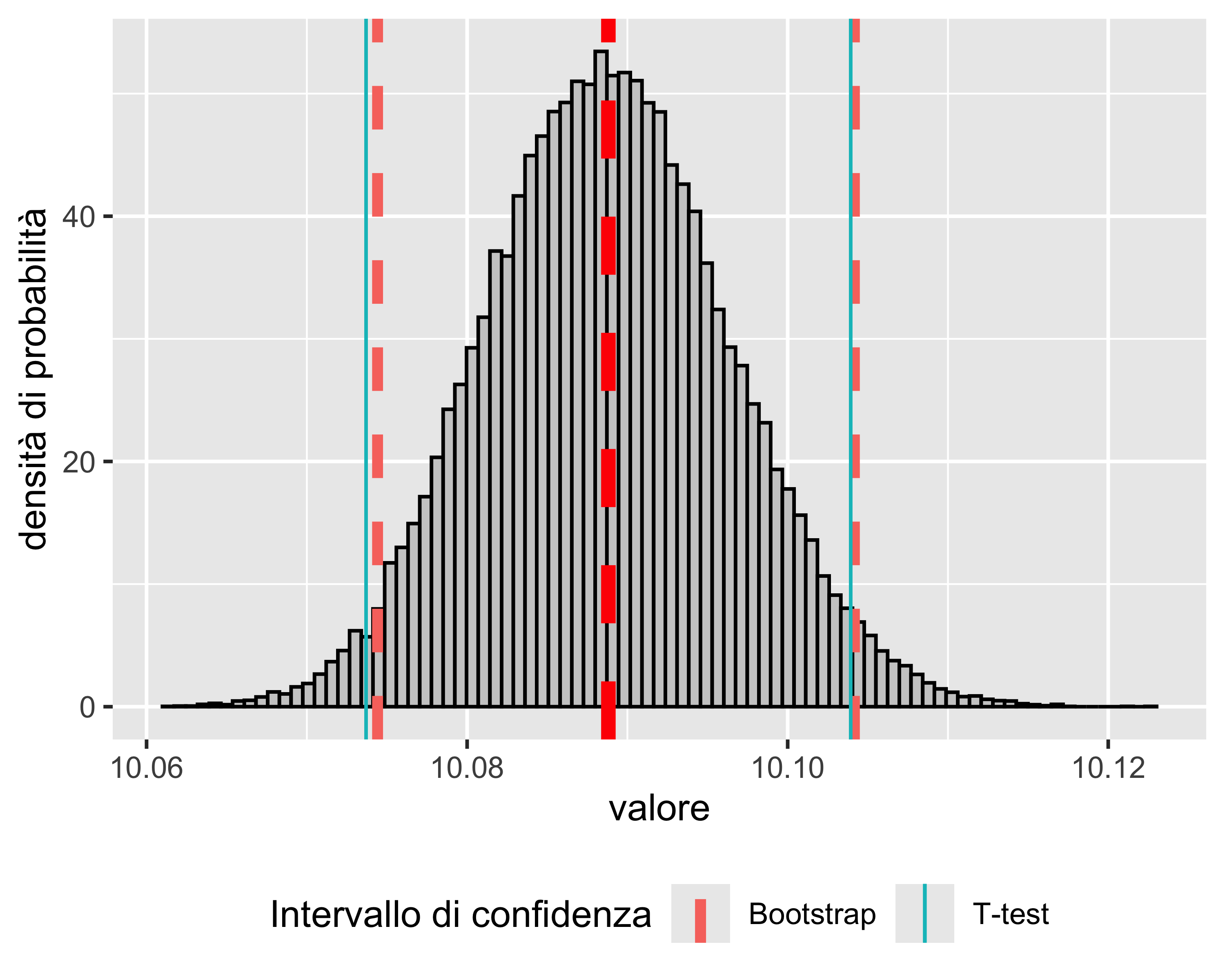 NOTA: confrontando con l’intervallo calcolato dal T-test si nota che il limite inferiore è diverso: ciò è dovuto all’assimmetria della distribuzione del campione di base