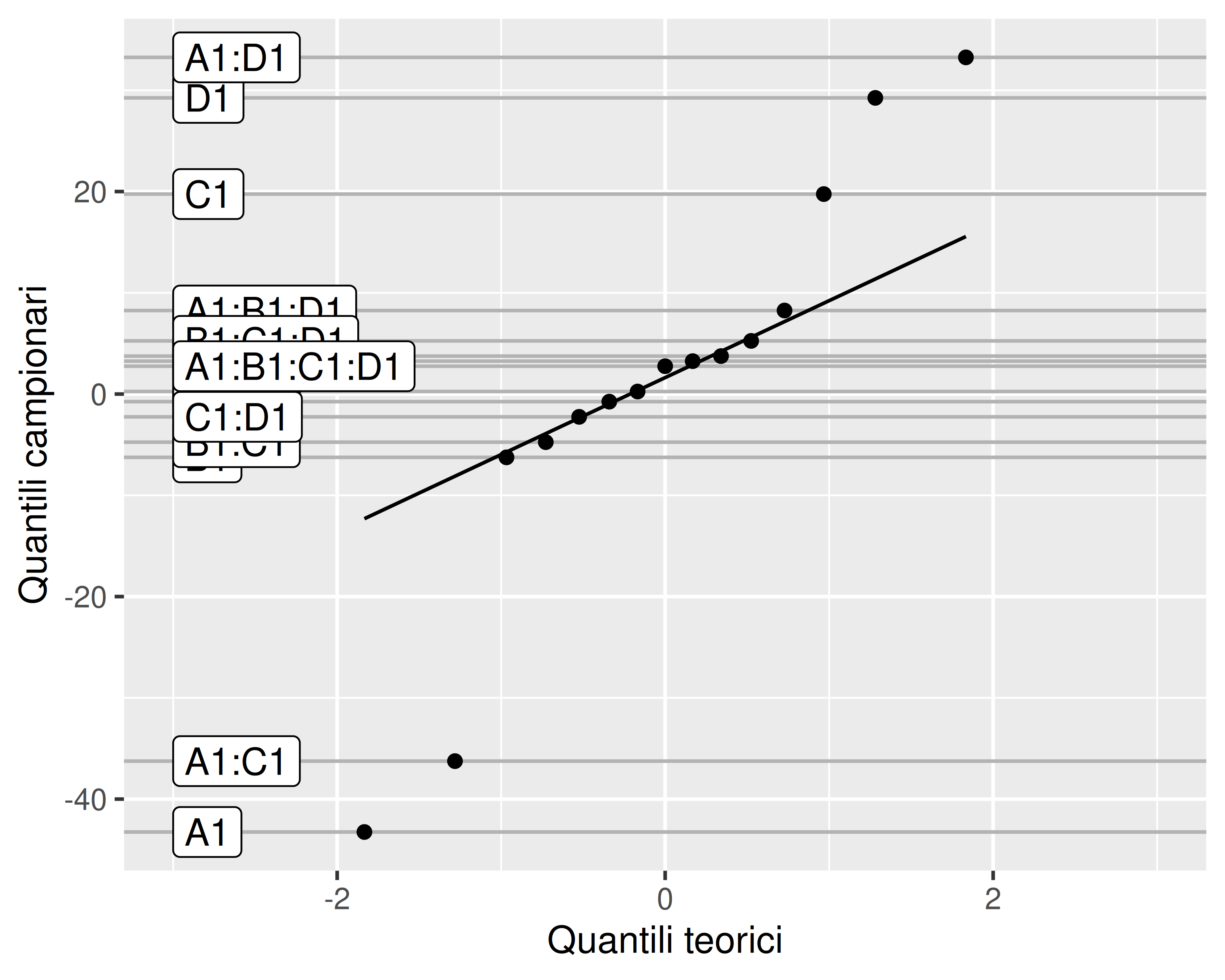In questo caso risultano non-normali solo gli effetti \(A, C, D\) e le interazioni \(AC\) e \(AD\)
