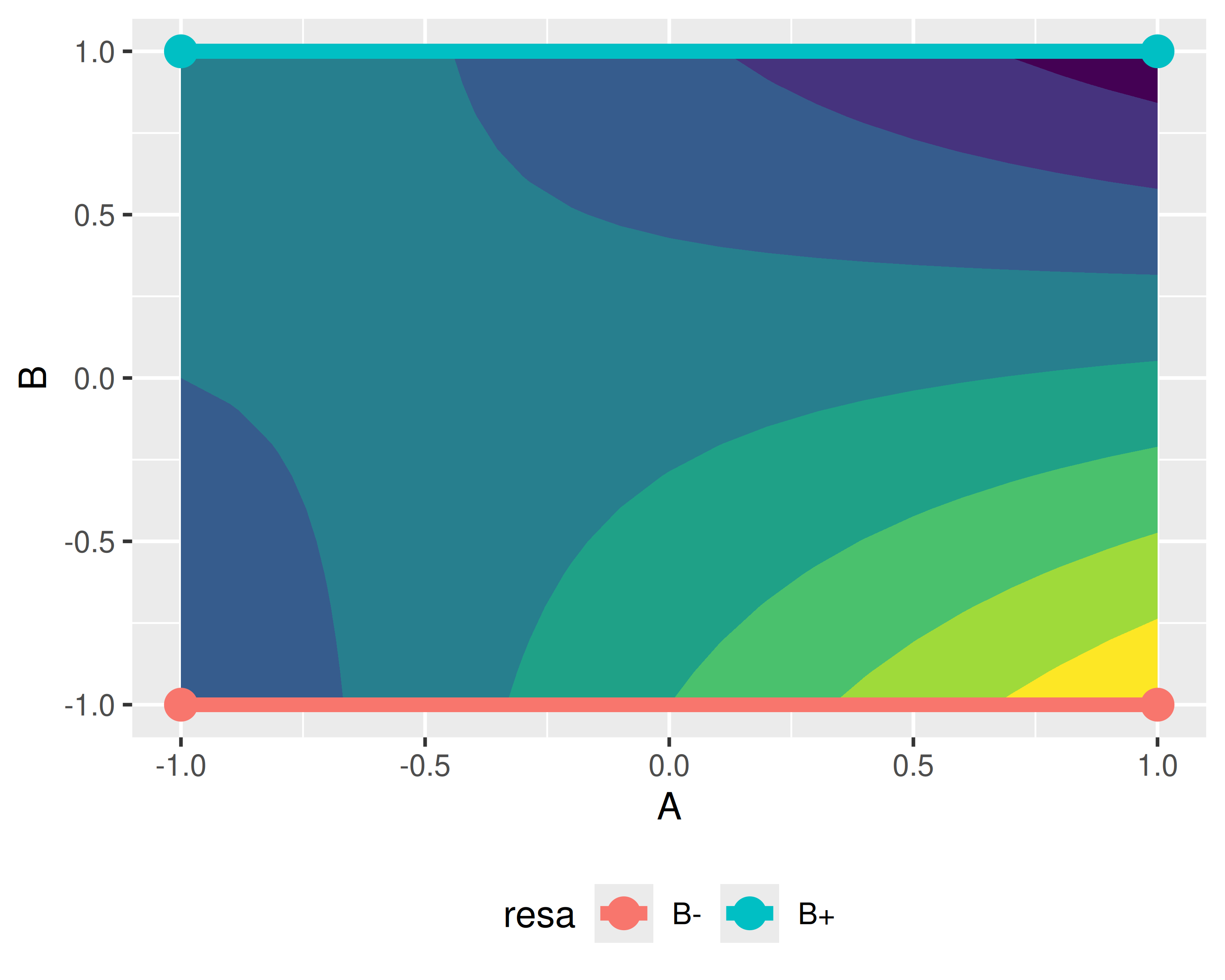 Possiamo stimare sia gli effetti di \(A\) e \(B\) che l’interazione \(AB\):