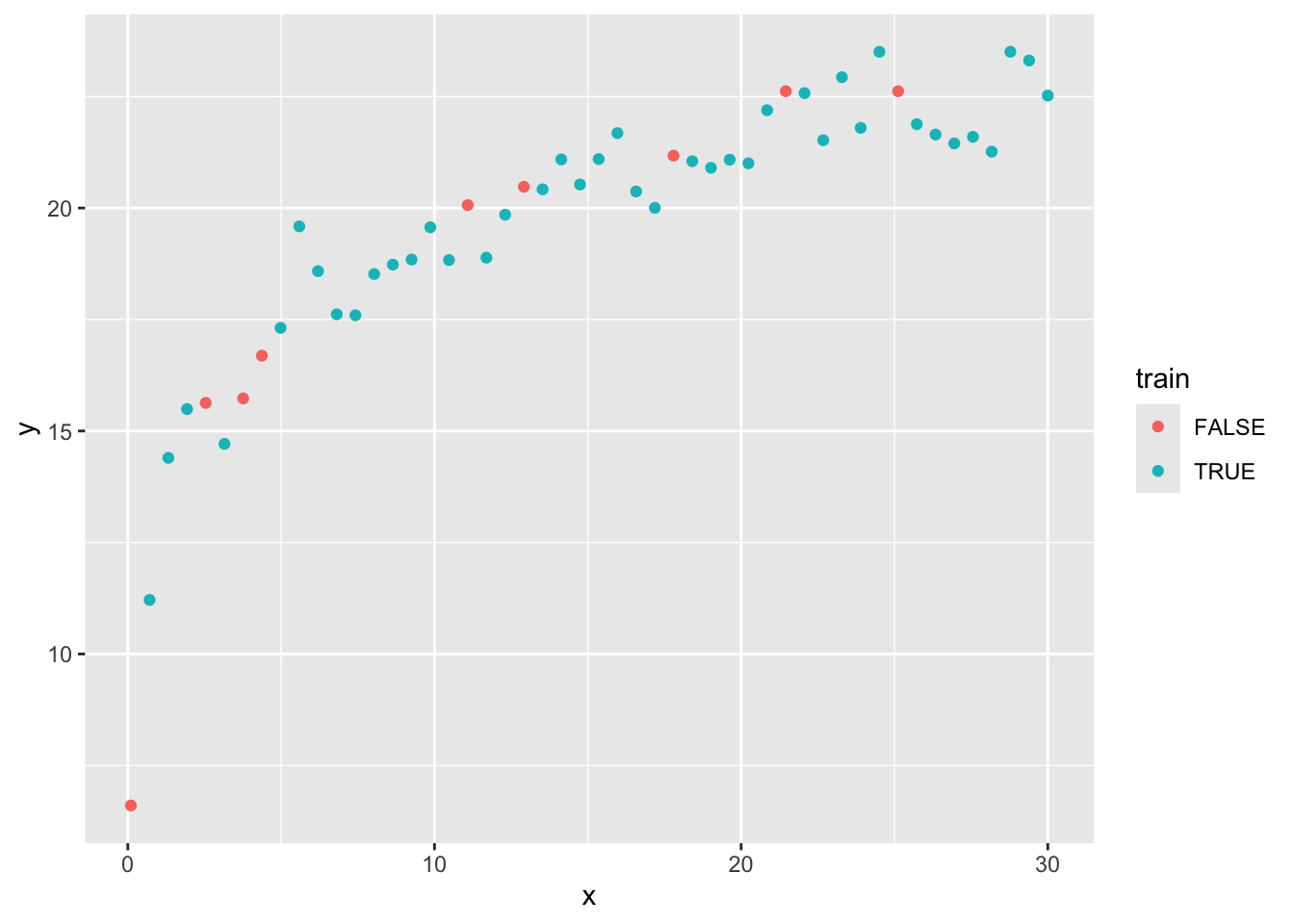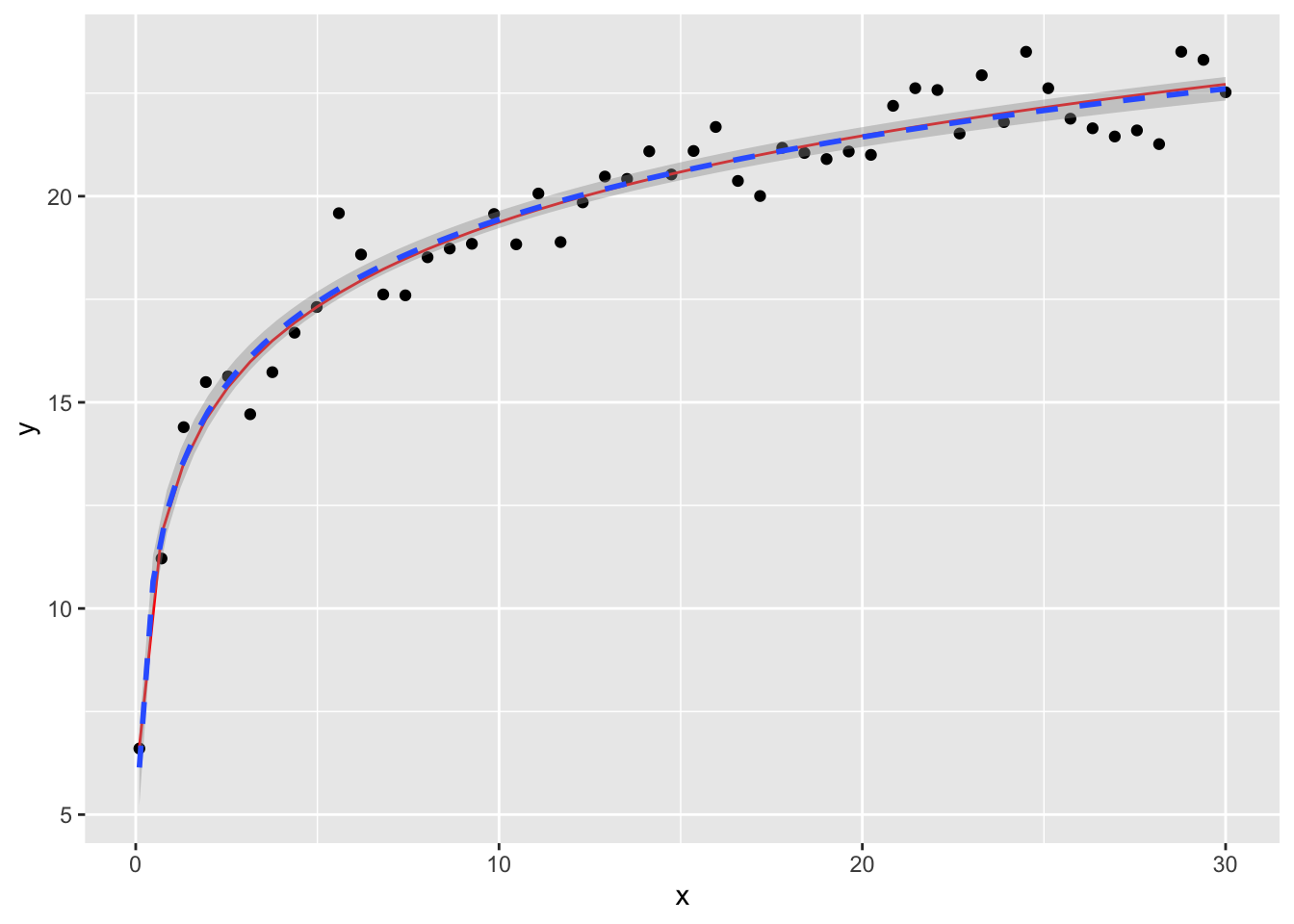 df %>%filter(train) %>%ggplot(aes(x=x, y=y)) +geom_point() +geom_smooth(method ="lm",formula = y ~I(x^0.1) ) +geom_smooth(method ="lm",formula = y ~log(x),color="red" )