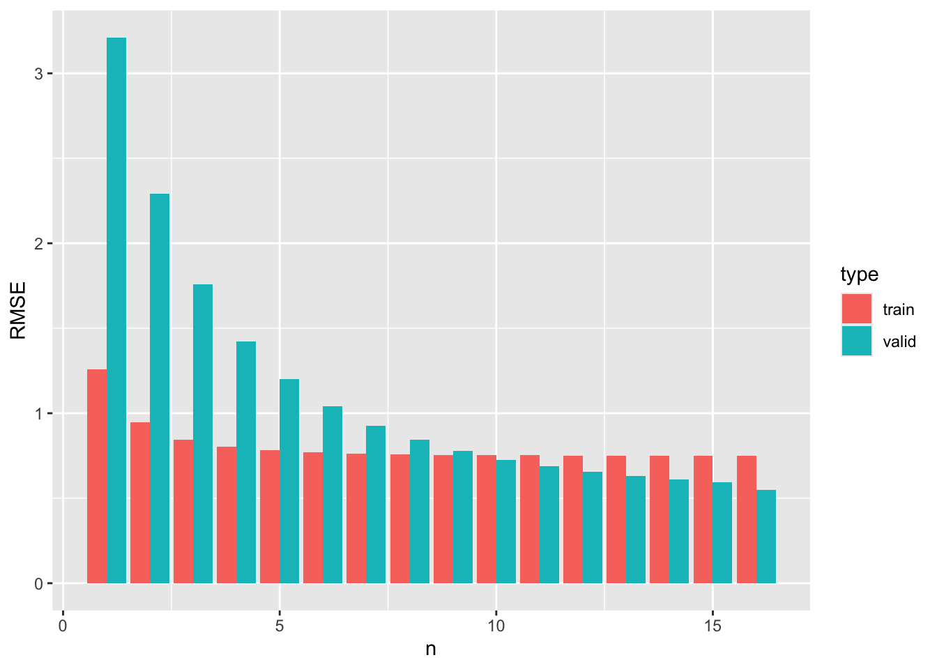 L’ultima barra corrisponde al modello logaritmico. Si osserva che RMSE di tale modello per i dati di training e per quelli di valdazione è effettivamente il minimo, anche se l’esponente \(1/15\) produce risultati ancora migliori di \(1/10\). Tutavia, per \(n\gt10\) non si osservano sensibili miglioramenti per l’RMSE sui dati di validazione.