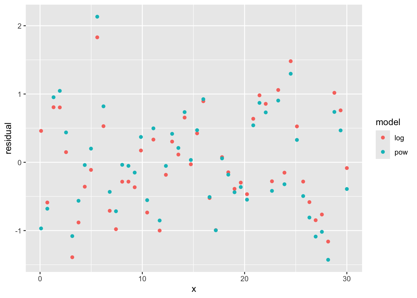 Confrontiamo due regressioni lineari, una col modello \(y=a + b\log(x)\), una col modello \(y=a + b/x^{0.1}\):