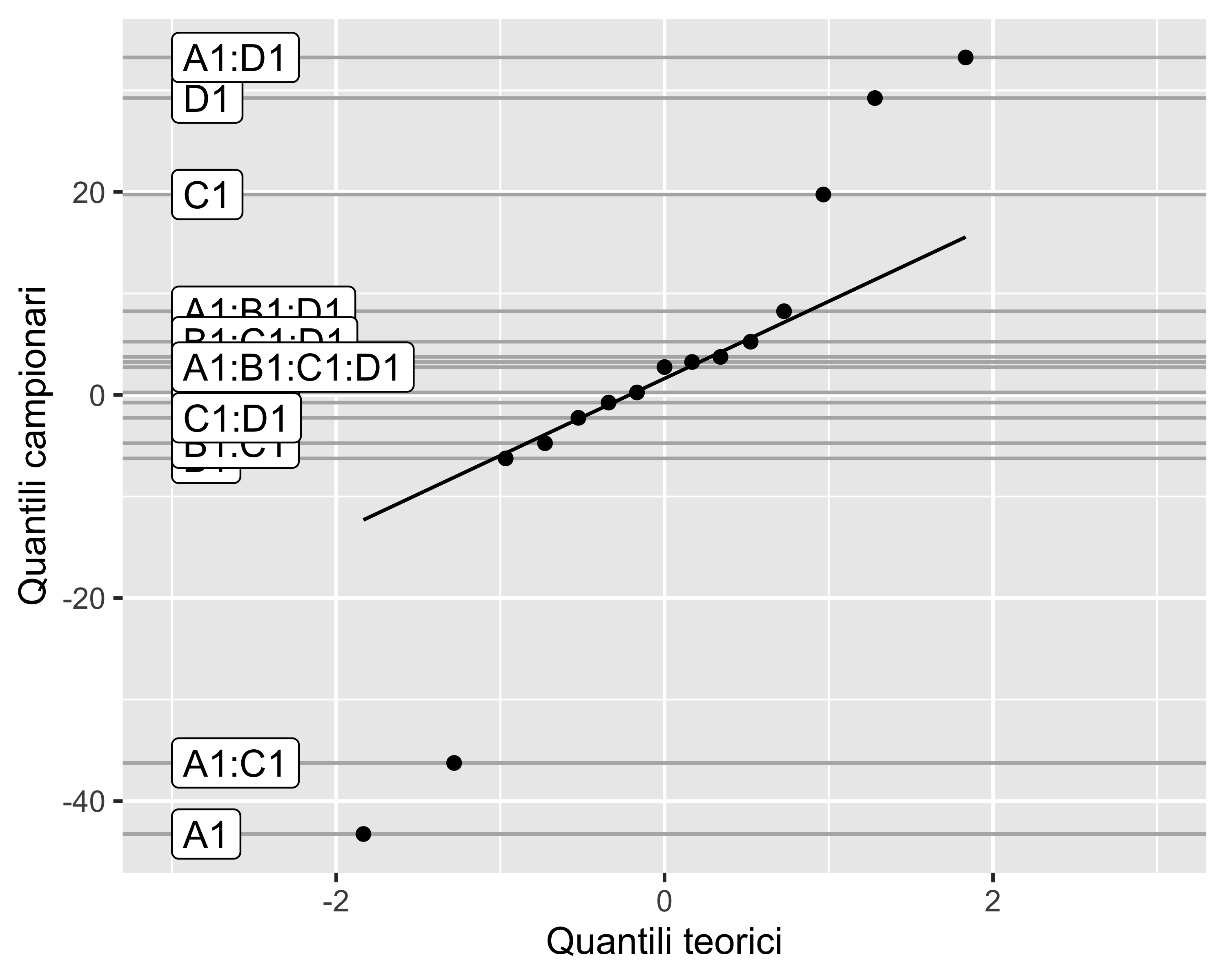 In questo caso risultano non-normali solo gli effetti \(A, C, D\) e le interazioni \(AC\) e \(AD\)