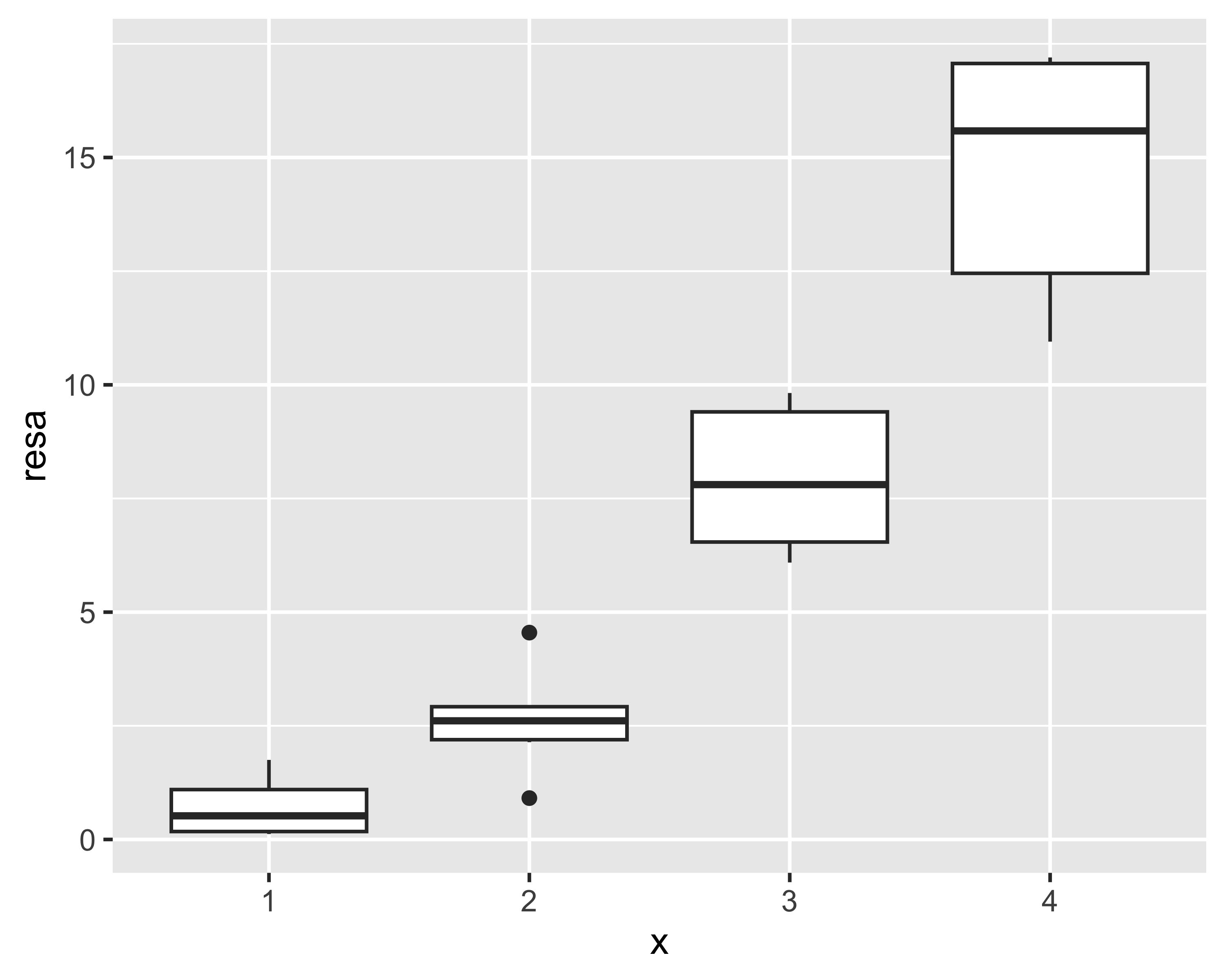 Se osserviamo dal boxplot che la resa tende ad aumentare più che linearmente con \(x\), possiamo pensare di riformulare il modello trasformandolo mediante un’elevazione al quadrato: