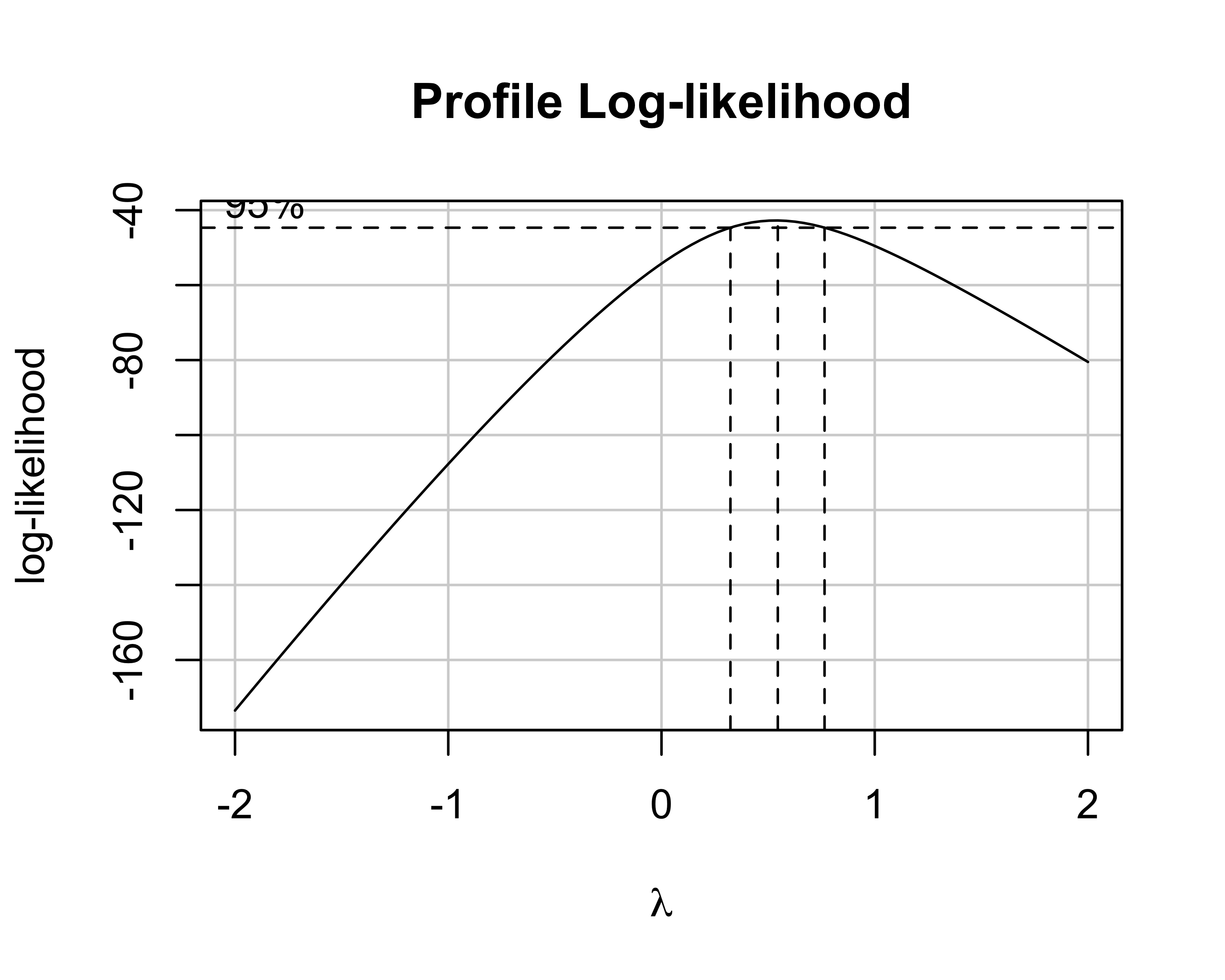 Ad es., se risultasse un \(\lambda\) ottimale pari a 0.58, sceglierei comunque \(\lambda=0.5\), che corrisponde alla trasformazione \(y^*=\sqrt{y}\)
