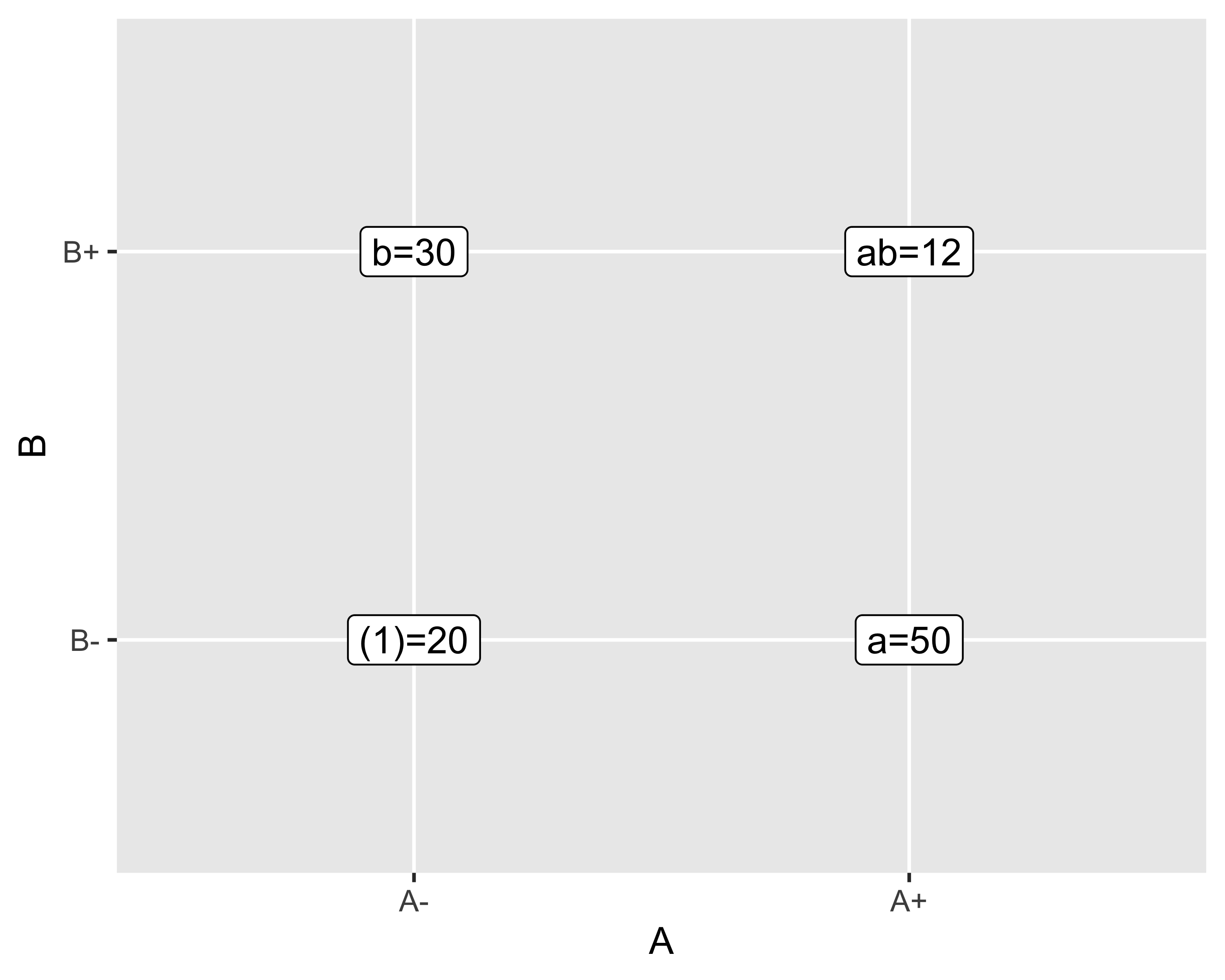 \[ \begin{align} A &= \frac{a+ab}{2} - \frac{(1) + b}{2} = 6\\ B &= \frac{b+ab}{2} - \frac{(1) + a}{2} = -14 \\ AB &= \frac{a+b}{2} - \frac{(1)+ab}{2} = -24 \end{align} \]