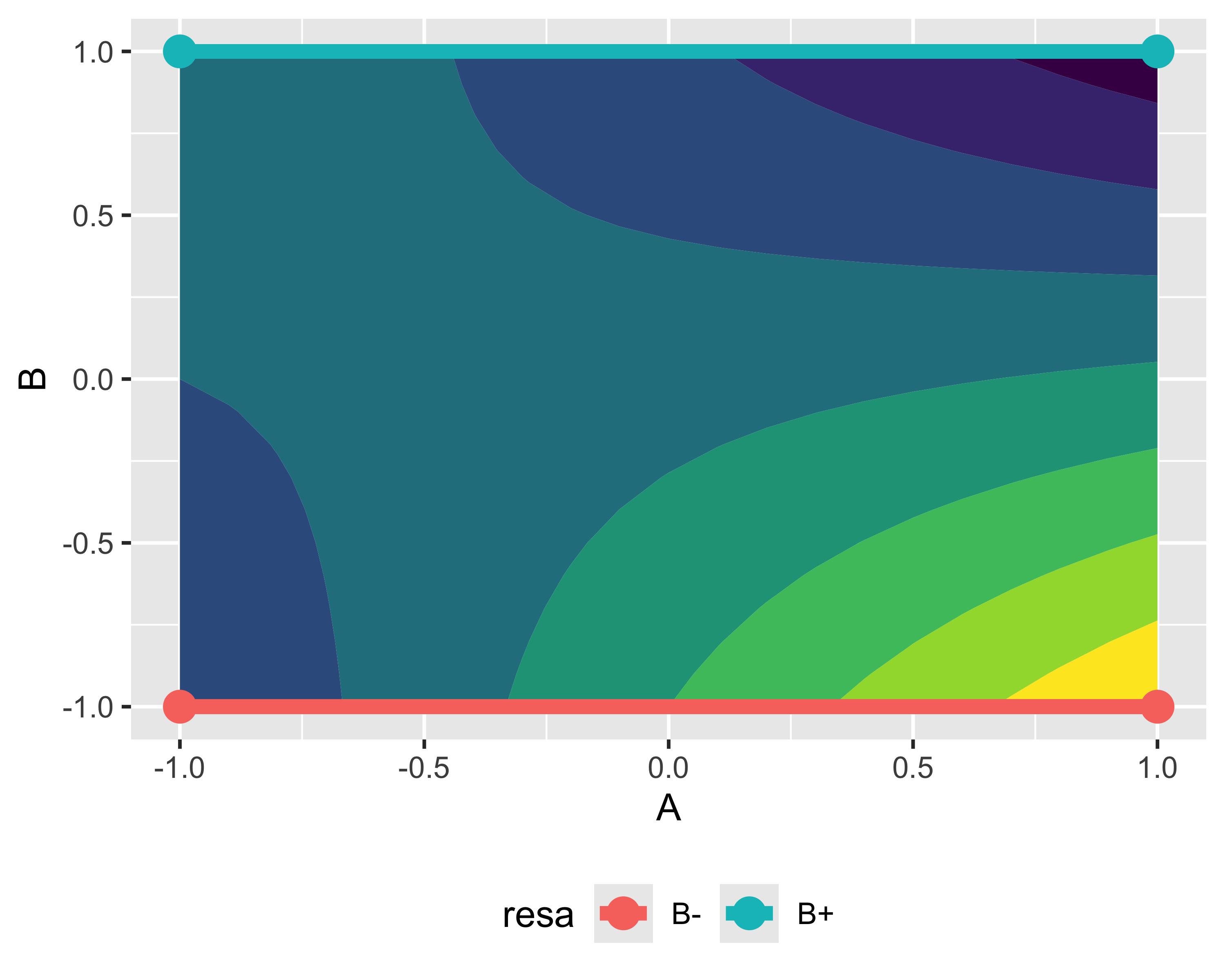 Possiamo stimare sia gli effetti di \(A\) e \(B\) che l’interazione \(AB\):