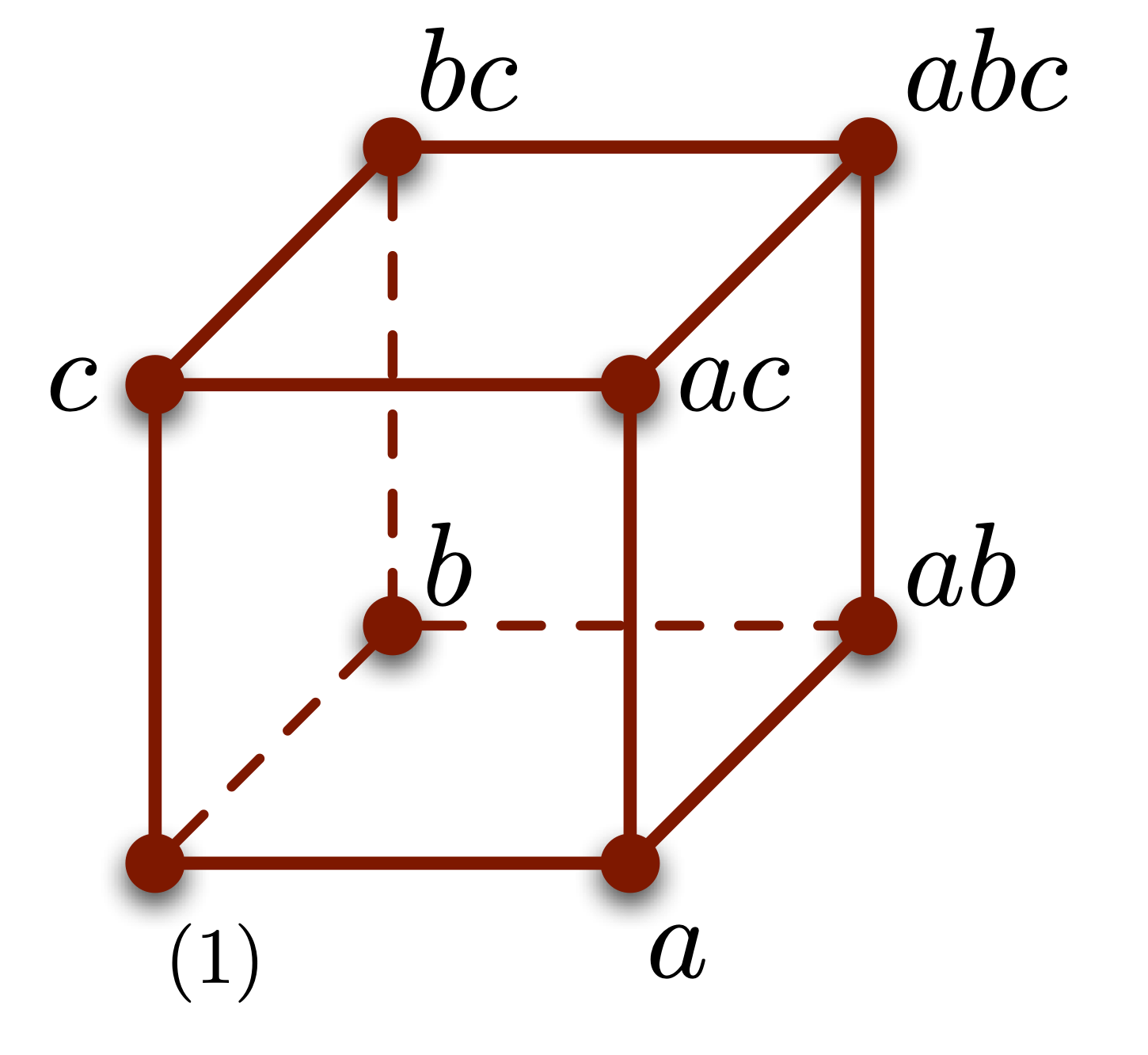 Supponiamo di considerare soltanto i vertici opposti del PF in figura: \((1), ab, ac, bc\)