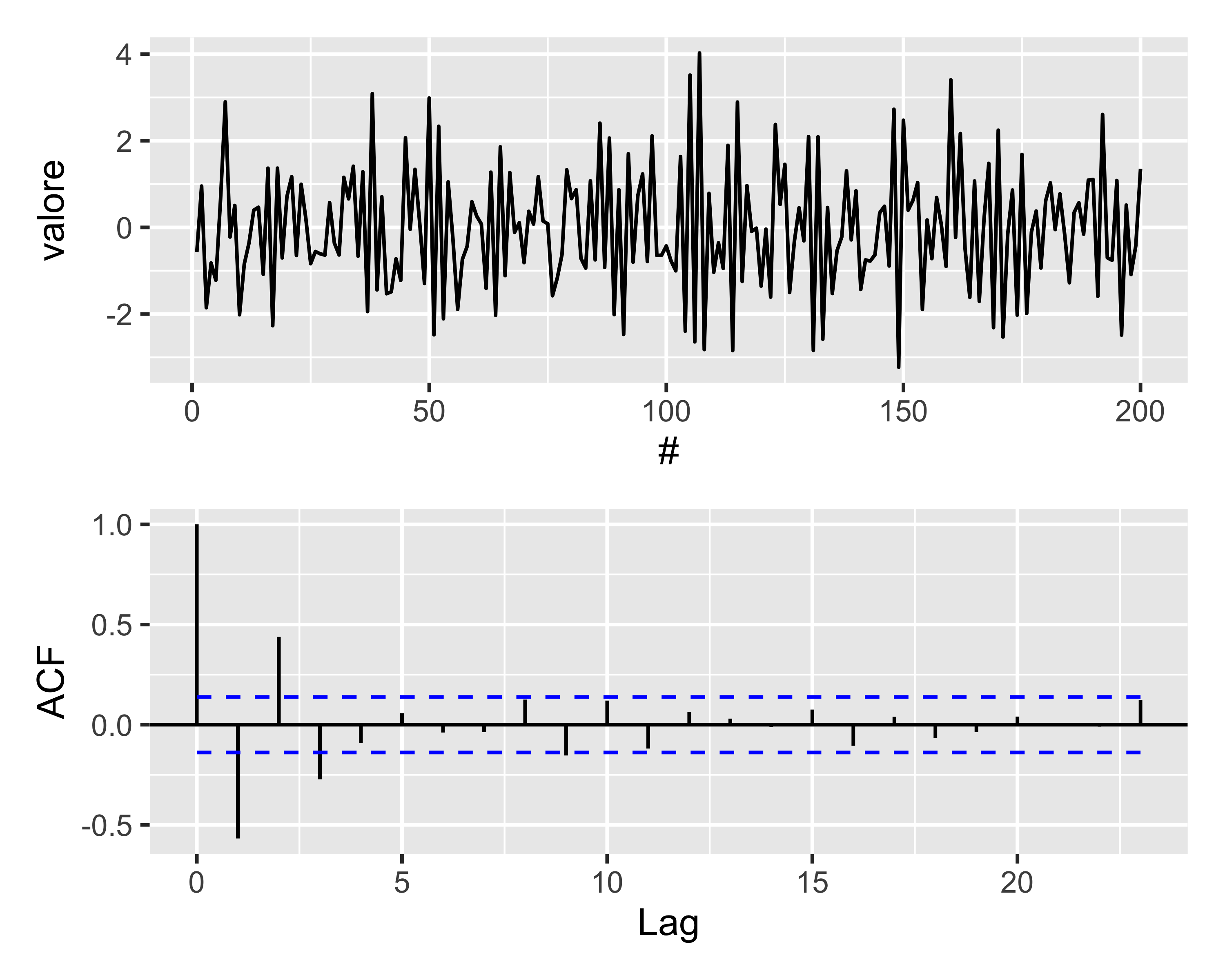 Il processo viene ripetuto per \(\ell=0, 1, \dots, n\), con \(n\) scelto in funzione della dimensione della serie, tipicamente pari ad almeno 50 e comunque non oltre la metà della lunghezza della s.t.