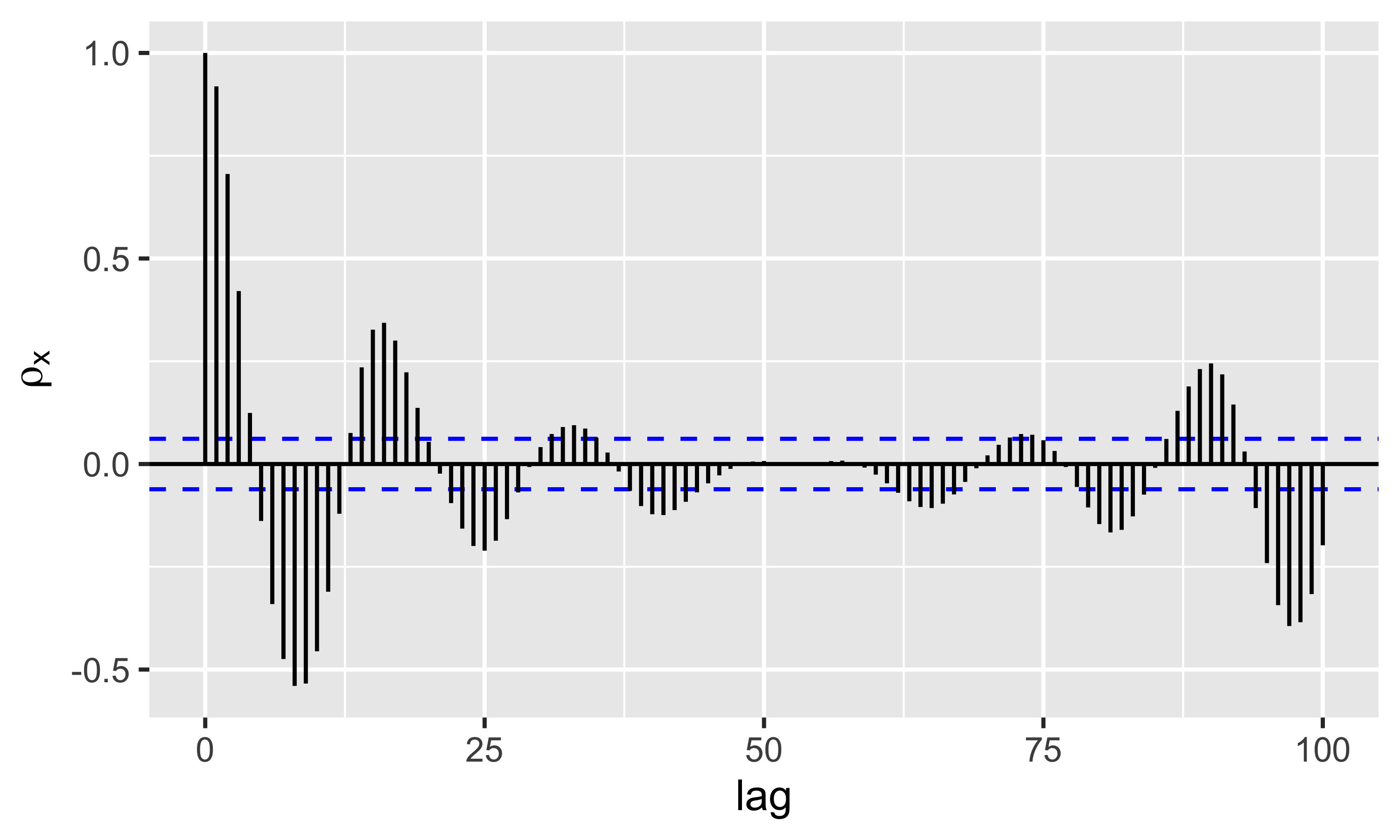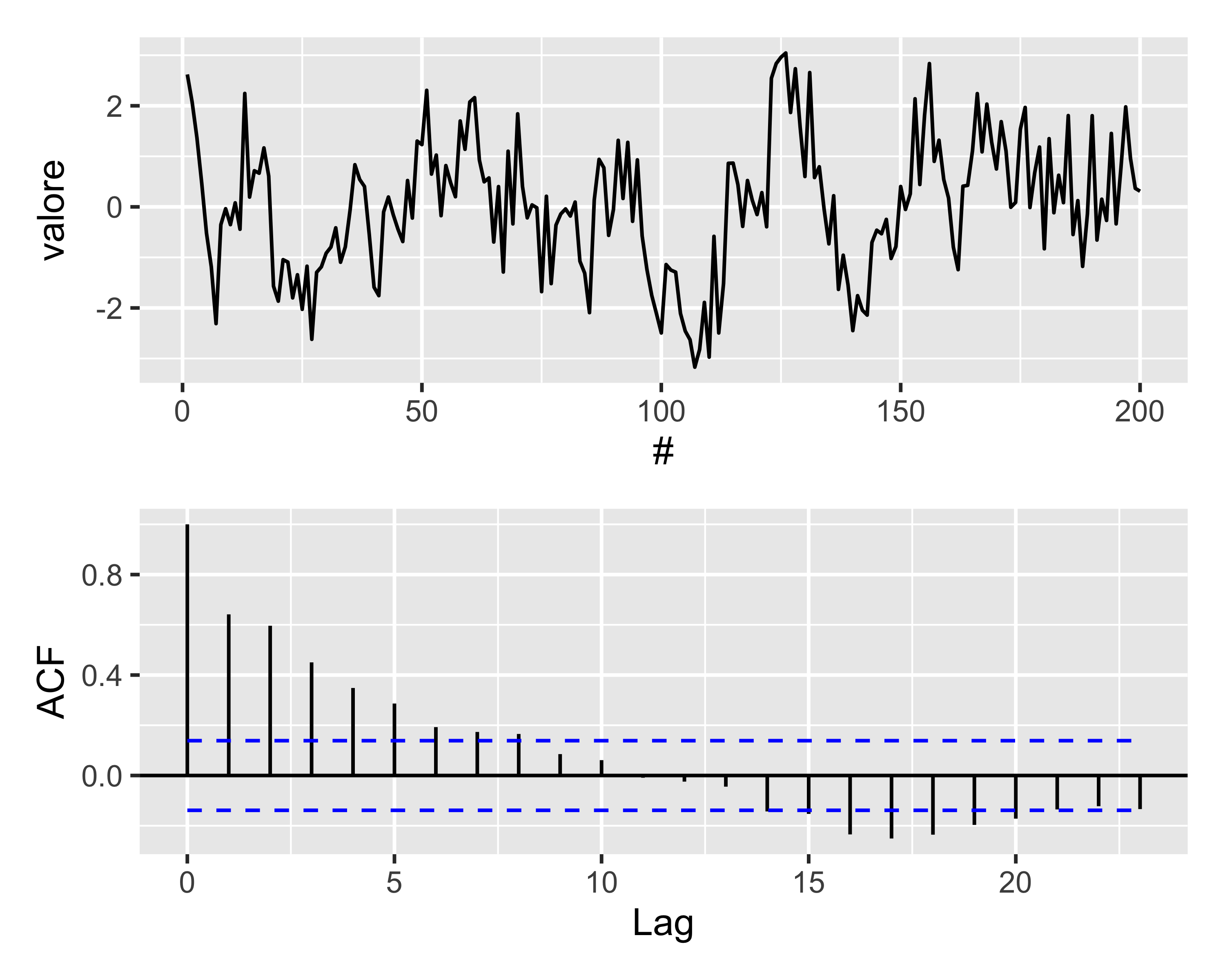 La funzione di autocorrelazione \(\rho_x(\ell)\) che è una funzione a valori discreti, può essere messa in grafico per studiare il lag massimo al di sopra del quale la serie storica \(x\) non è più autocorrelata