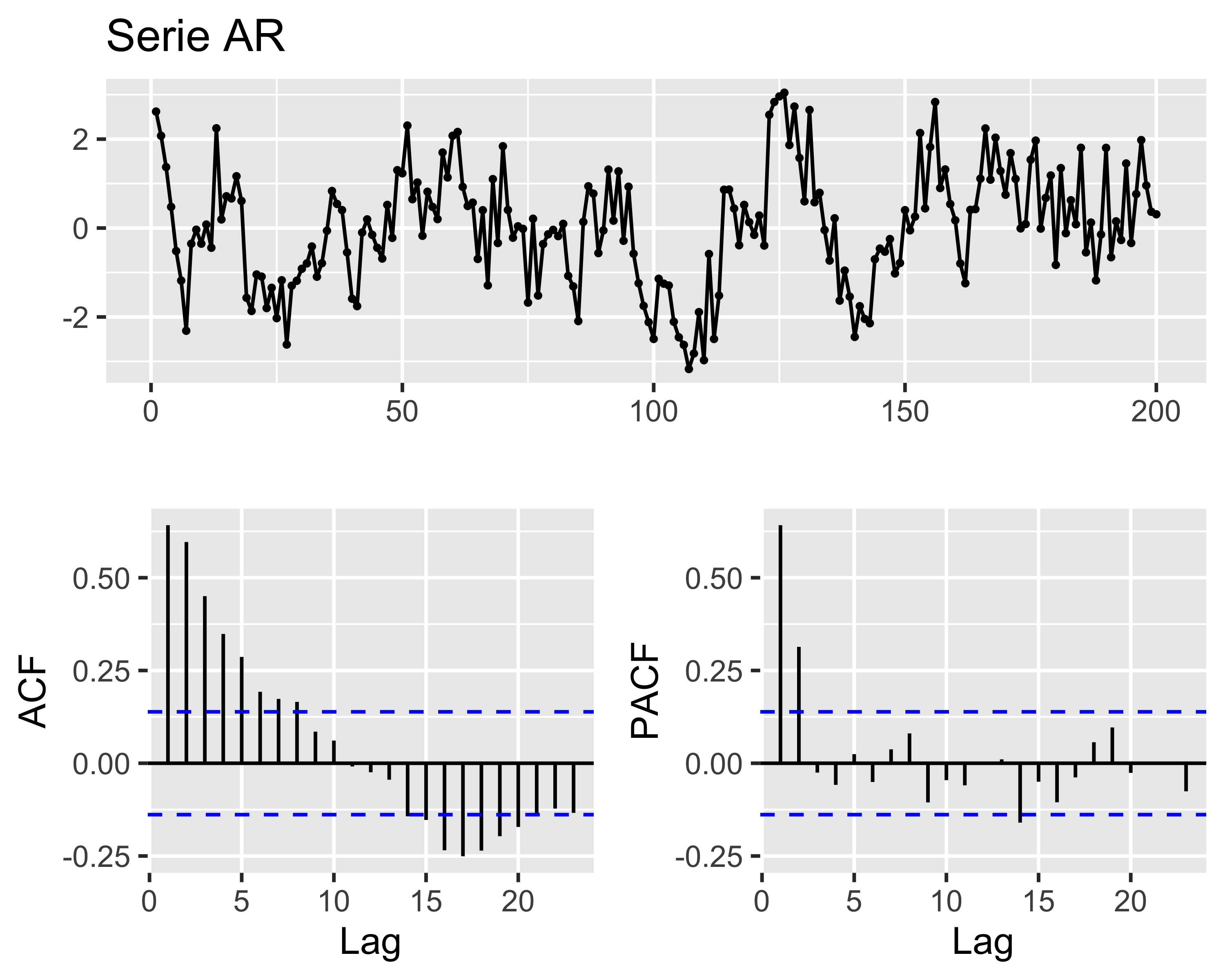 Se invece la serie temporale è di tipo \(AR(p)\), ogni osservazione dipende dall’innovazione e da tutte le osservazioni precedenti, in modo ricorsivo