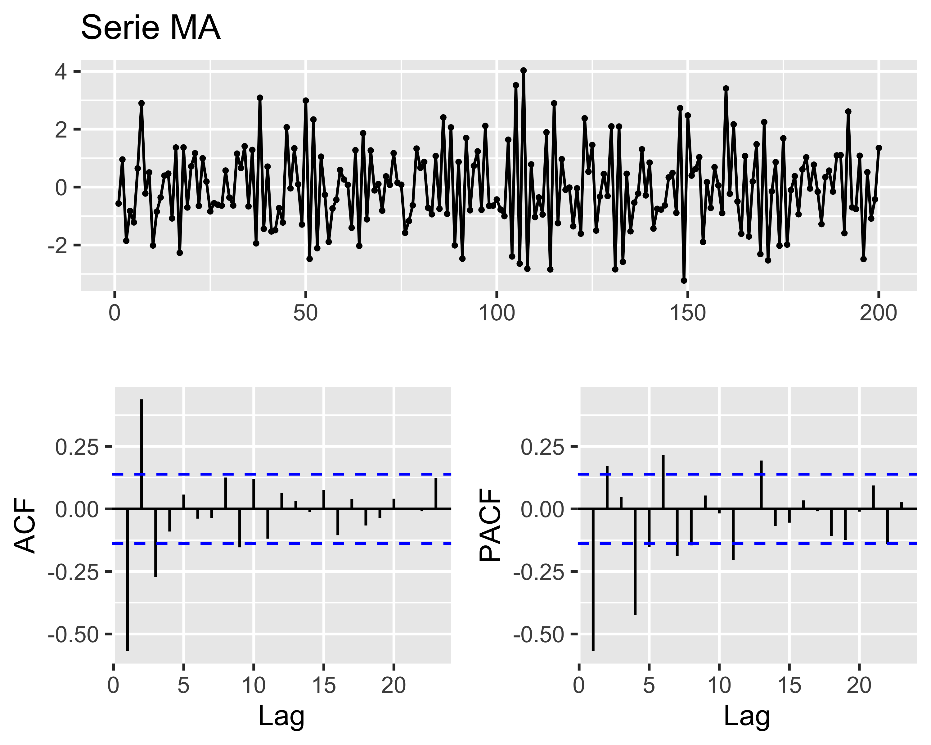 Quindi, data una serie temporale di tipo \(MA(q)\) si può spesso identificare l’ordine dalla sua ACF, contando i picchi dopo quello a lag 0: