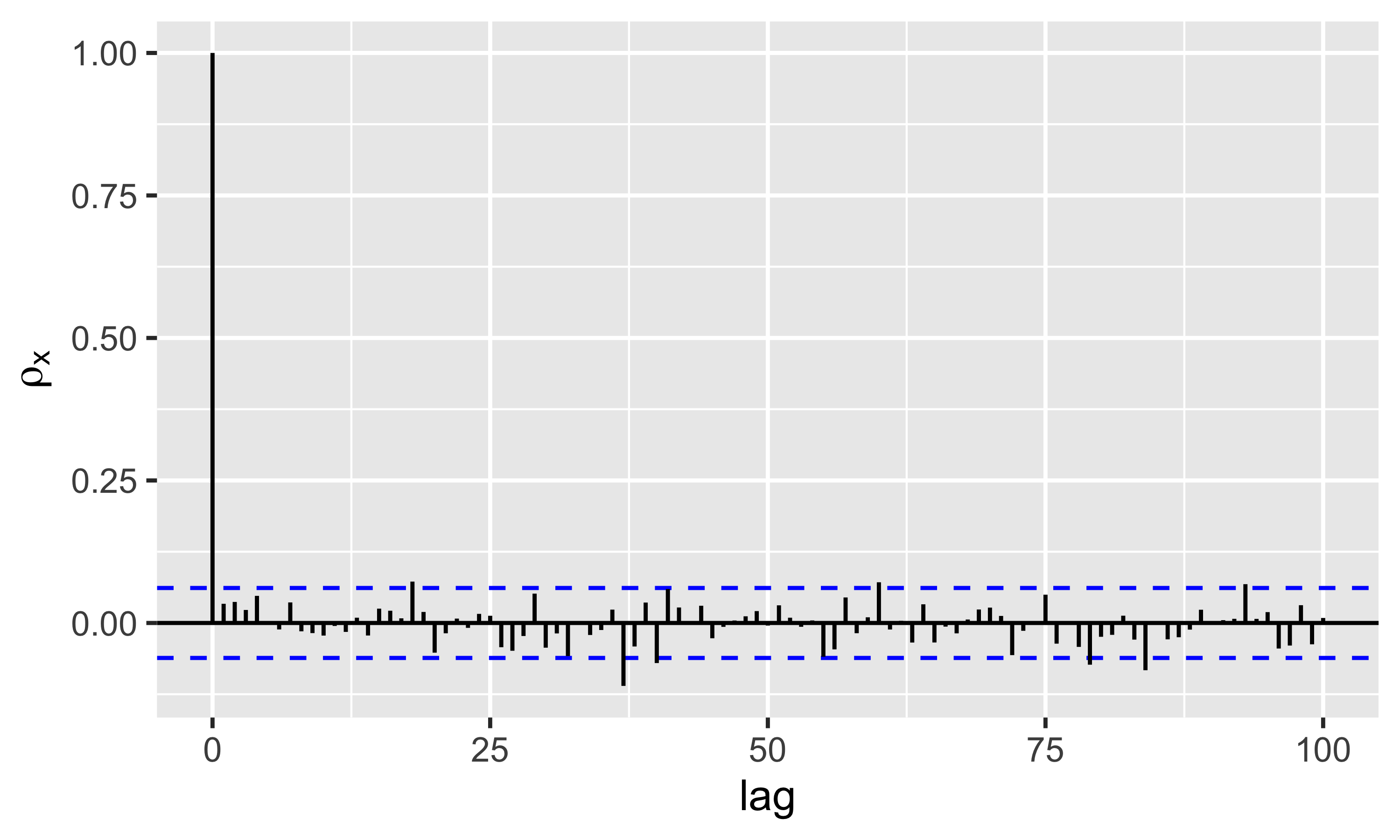 Come atteso, l’unico valore della ACF fuori dall’initervallo di confidenza è \(\rho_x(0)\)