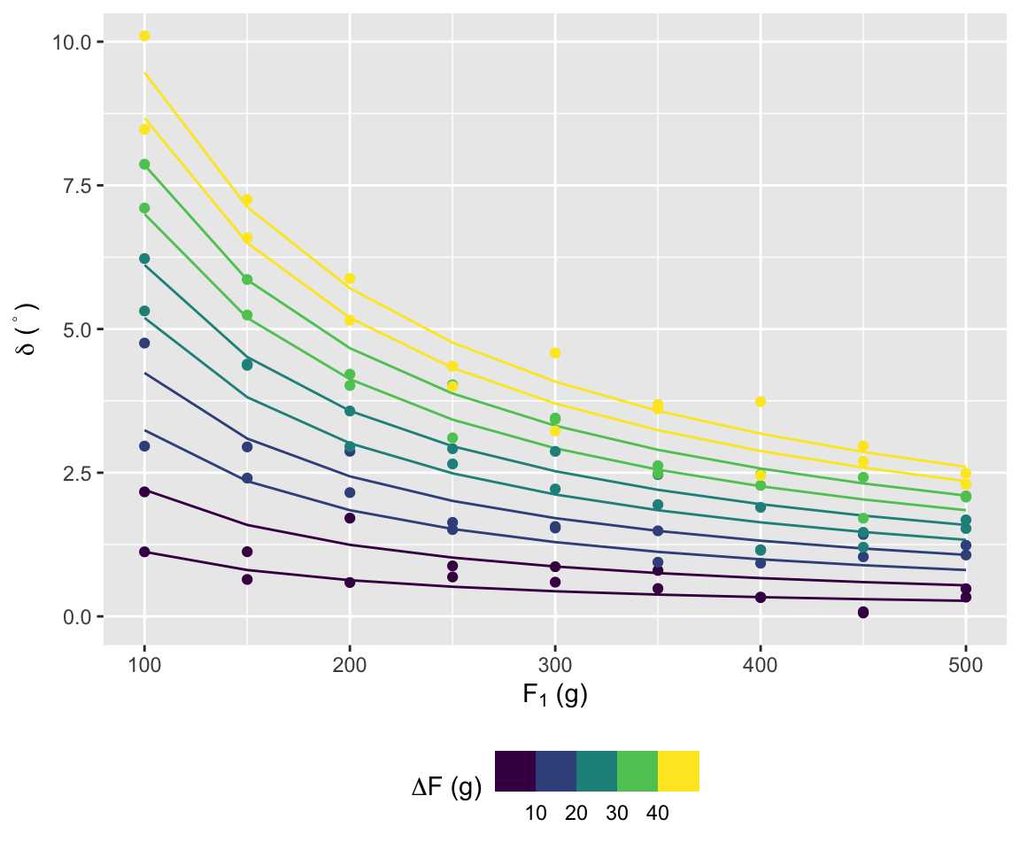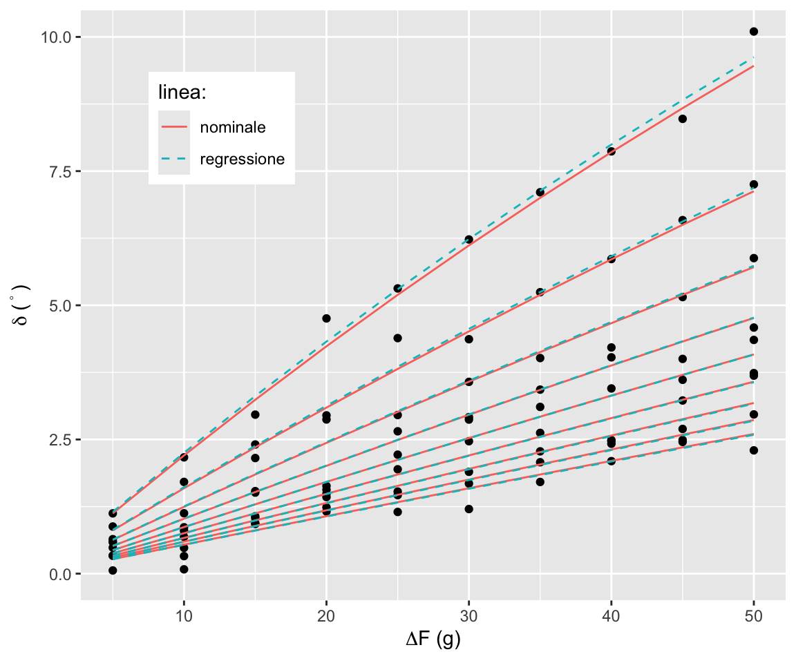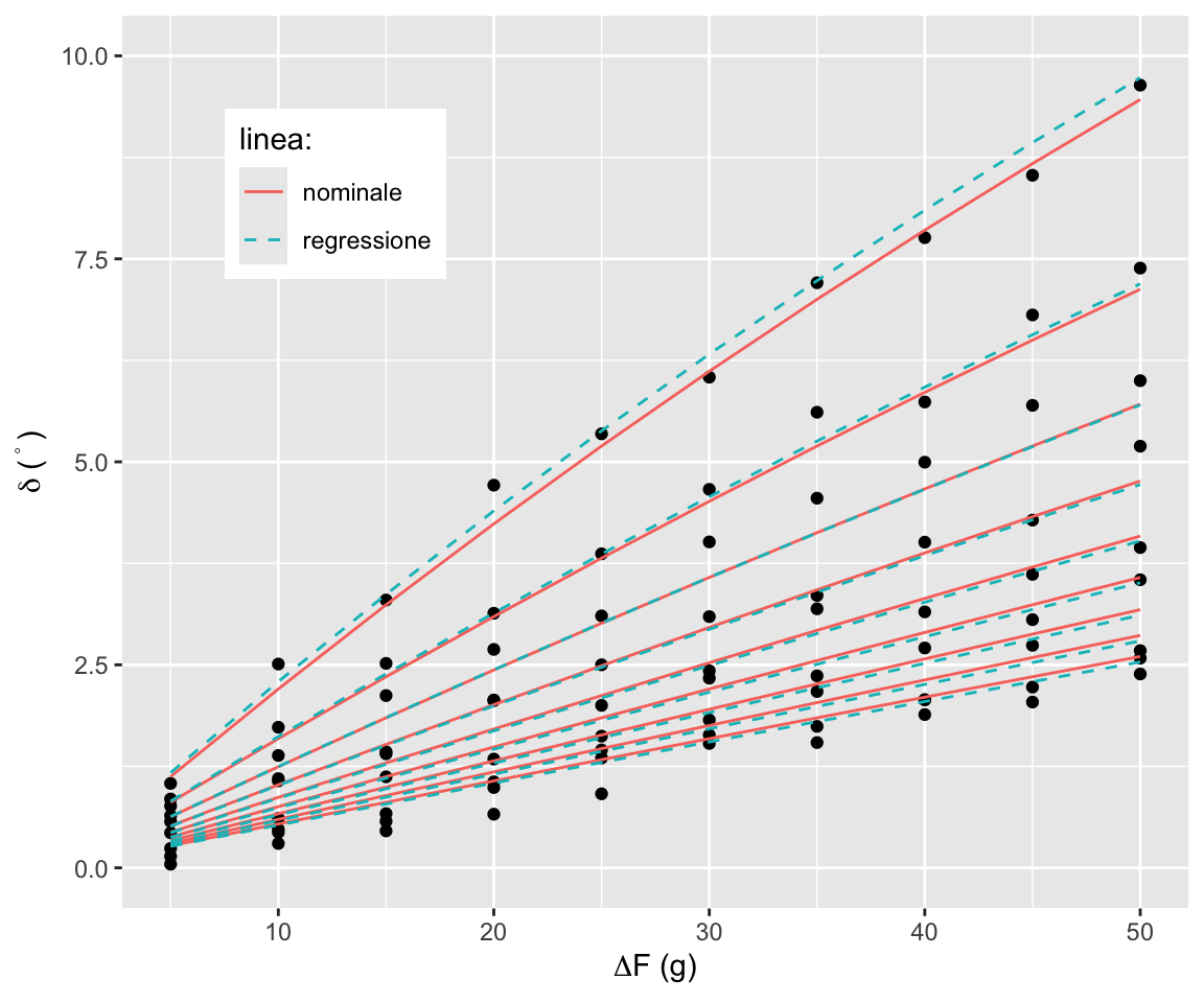 Raccogliamo l’angolo di equilibrio per carichi sul piatto sinistro pari a \(F_1=100, 150, \dots, 500\) g e sul piatto destro un valore uguale al piatto sinistro più \(\Delta F=5, 10, \dots, 50\) g