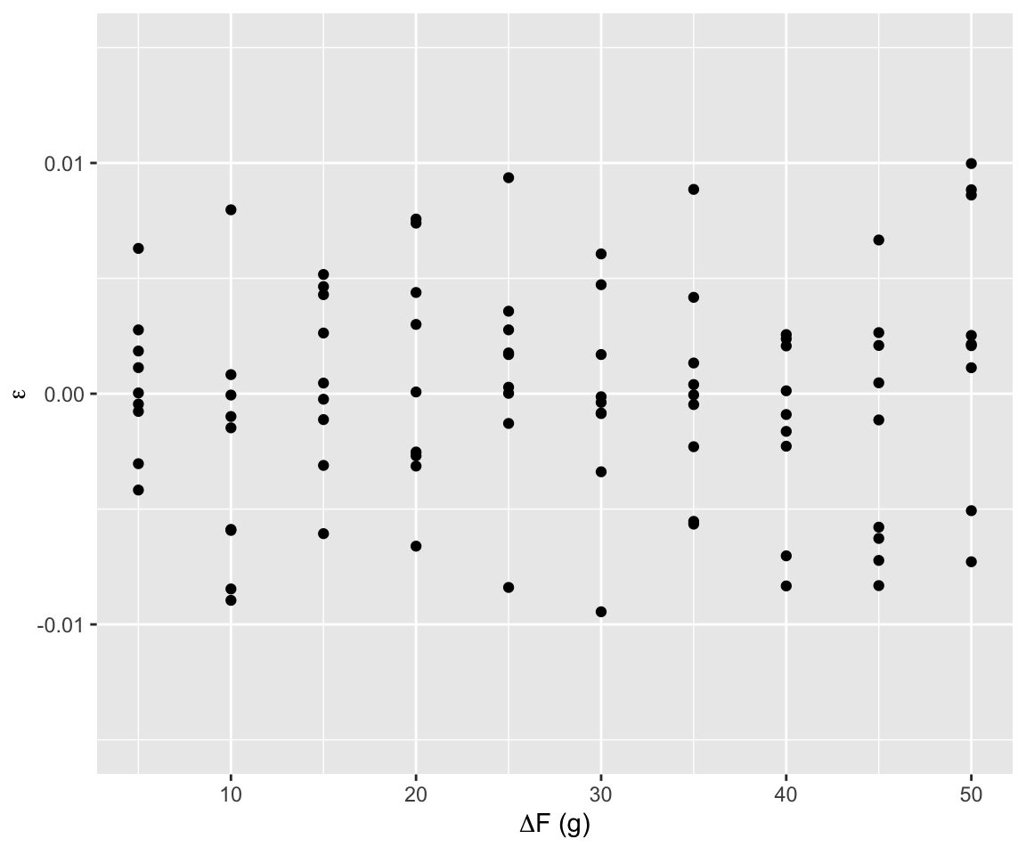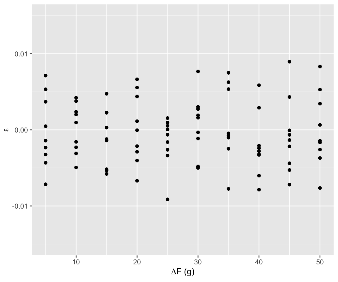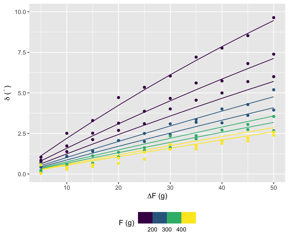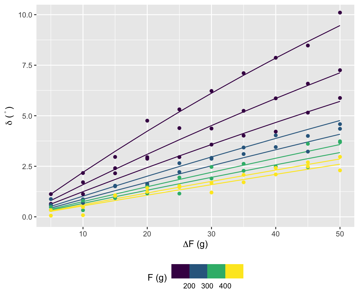 Raccogliamo l’angolo di equilibrio per carichi sul piatto sinistro pari a \(F_1=100, 150, \dots, 500\) g e sul piatto destro un valore uguale al piatto sinistro più \(\Delta F=5, 10, \dots, 50\) g