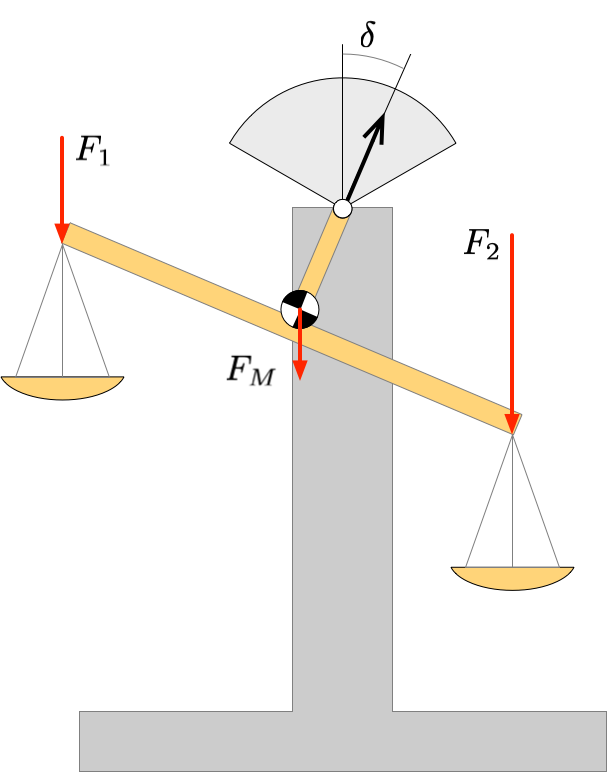 Il piatto sinistro è caricato con un peso noto \(F_1\) simile alla massa da pesare \(F_2\)