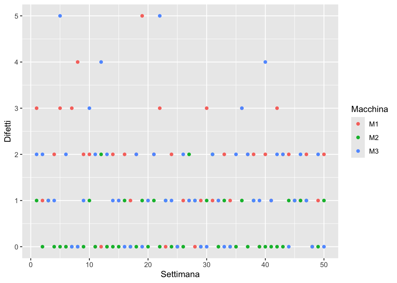 La tabella dati prod_defects.csv sul sito http://paolobosetti.quarto.pub/data.html#list-of-csv-files contiene dei dati di difettosità (come numero difetti per settimana) su 50 settimane di un impianto di produzione con tre macchine, M1, M2 e M3. Per le tre macchine i limiti massimi di difettosità sono, rispettivamente, 27, 32 e 100.