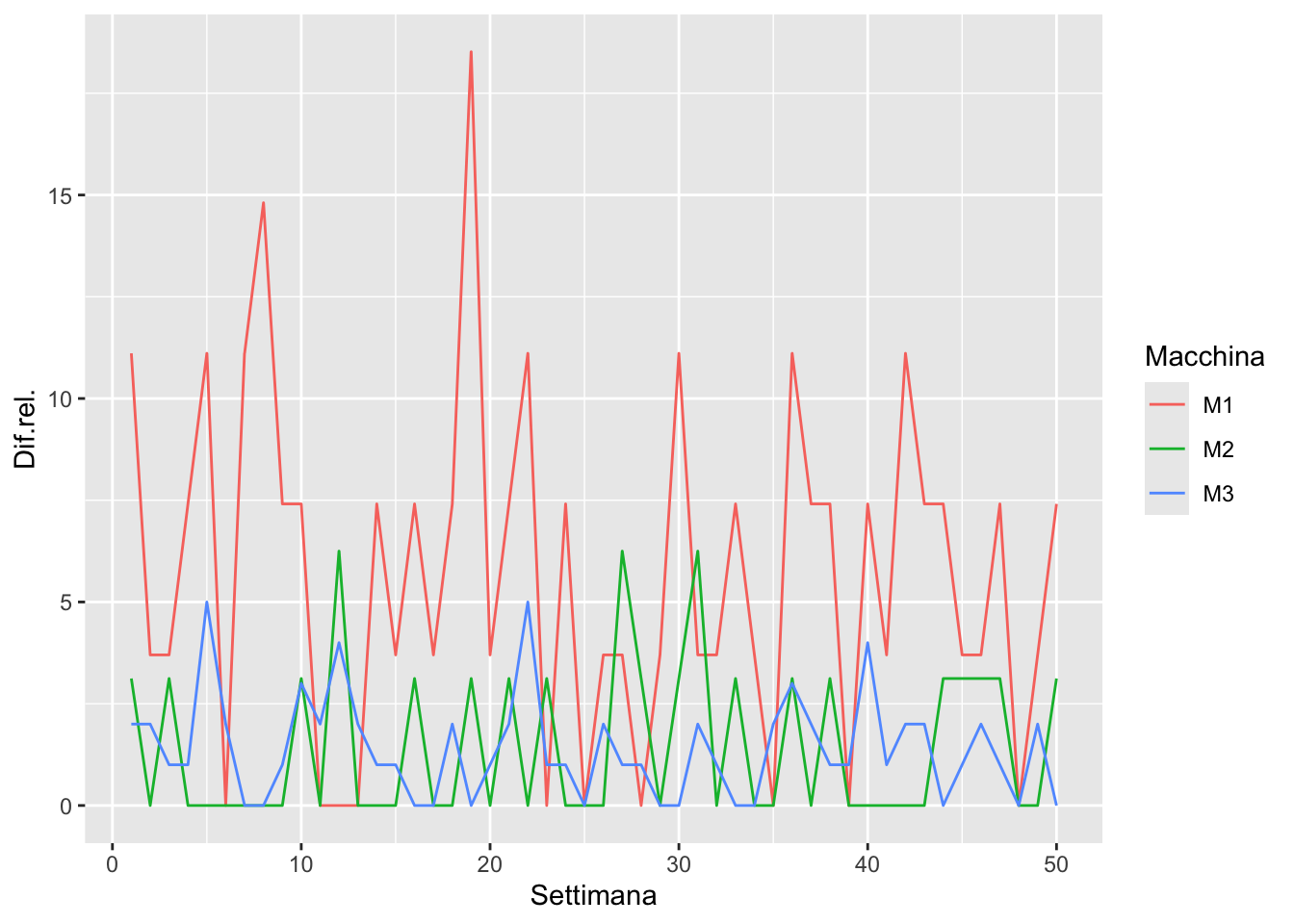 Creare una tabella che riporti, per ognuna delle 50 settimane, la difettosità in percentuale sul massimo per ciascuna macchina e realizzare il corrispondente grafico.