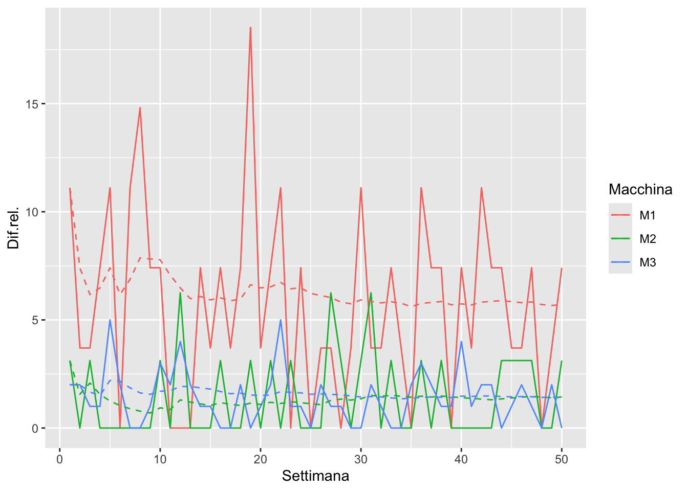 prod %>%# Calcolo difettosità relativaleft_join(limits, by =join_by(Macchina)) %>%mutate(`Dif.rel.`=(Difetti/max*100) %>%round(2)) %>%# Calcolo le medie progressive per gruppigroup_by(Macchina) %>%mutate(mean =map_dbl(1:n(), ~mean(`Dif.rel.`[1:.])) ) %>%ungroup() %>%# Graficoggplot(aes(x=Settimana, color=Macchina)) +geom_line(aes(y=`Dif.rel.`)) +geom_line(aes(y=mean), linetype=2)