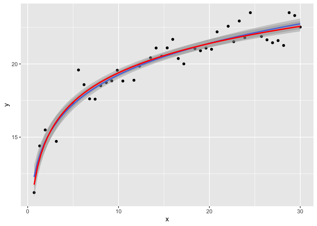 df %>%filter(train) %>%ggplot(aes(x=x, y=y)) +geom_point() +geom_smooth(method ="lm",formula = y ~I(x^0.1) ) +geom_smooth(method ="lm",formula = y ~log(x),color="red" )